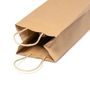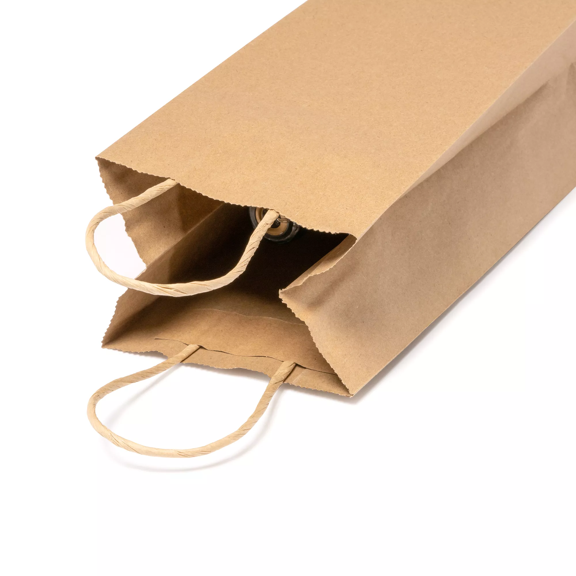Бумажный пакет плотностью 100 г/м² натурального цвета. Усиленные короткие ручки витой конструкции. Идеально подходит для бутылок.