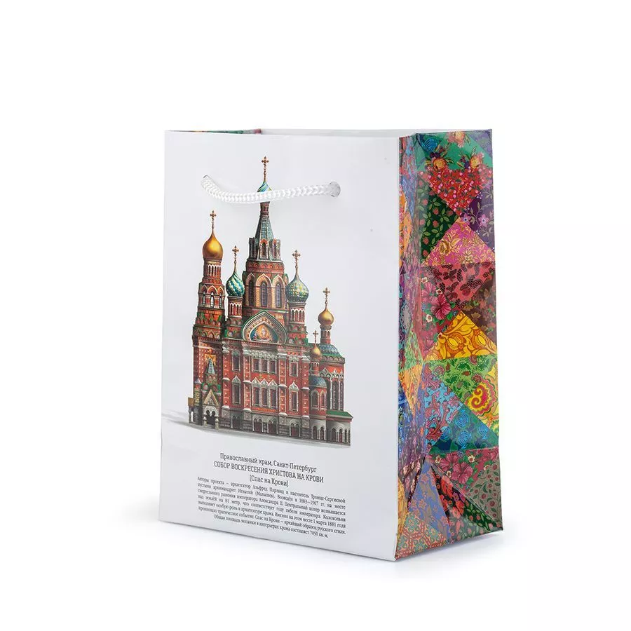 Пакет маленький Сугревъ Спаса на Крови Подарочный прочный ламинированный пакет с люверсами и плетёными верёвочными ручками из толстого шнура. Пакет снабжён авторской иллюстрацией и описанием истории собора Спаса на Крови на русском и английском языках и в этом смысле не имеет аналогов. Боковины пакета декорированы эффектным узором в стиле пэчворк, напоминающим лоскутное одеяло. Размер пакета позволяет положить в него одну или две маленькие упаковки чая. Это идеальное решение для ситуации, когда вам необходимо сделать много эффектных, но недорогих подарков. Размер: 14 х 11 х 6 см