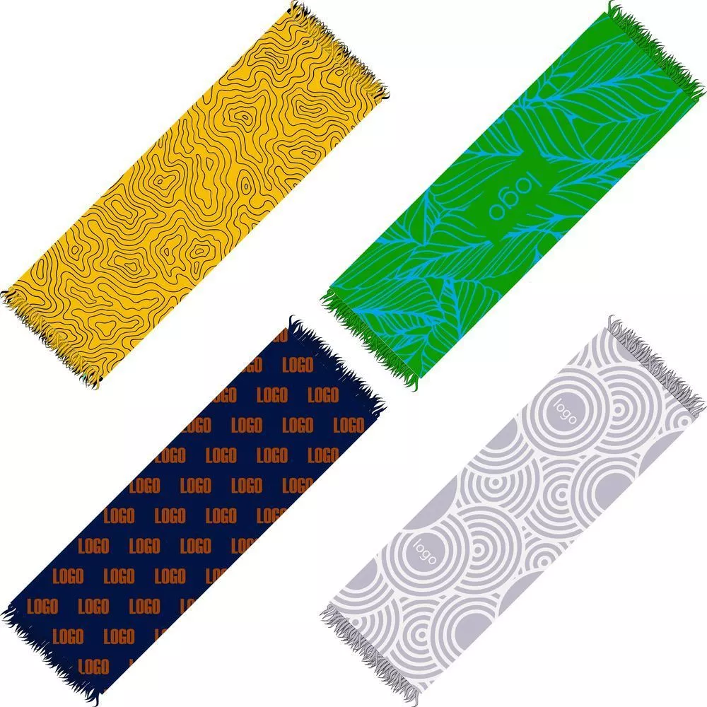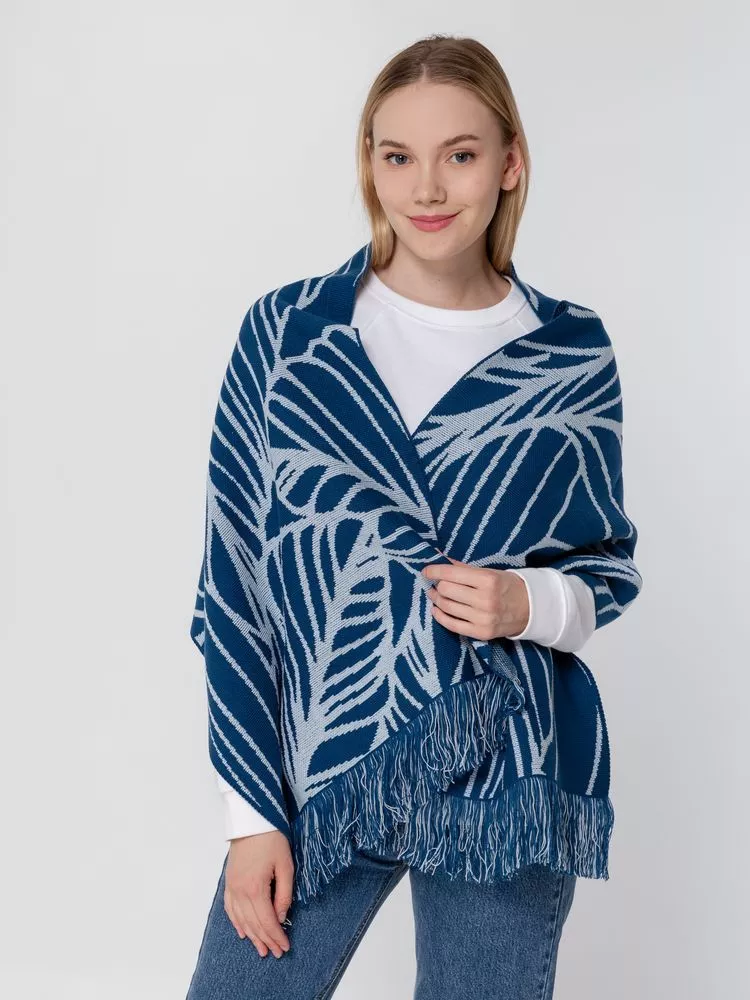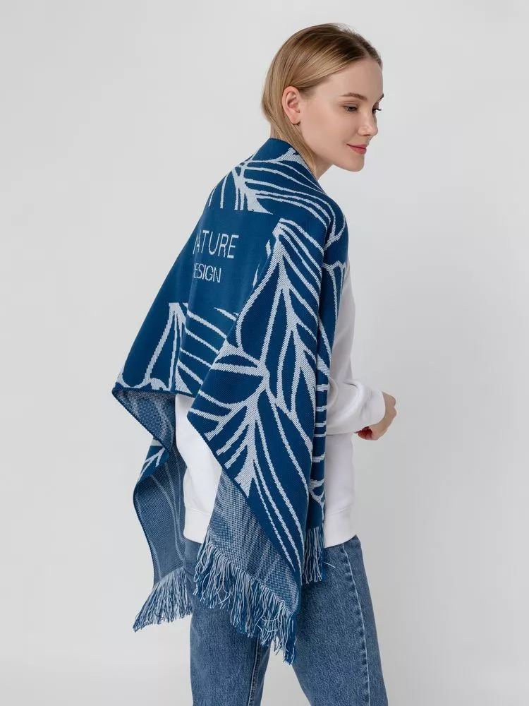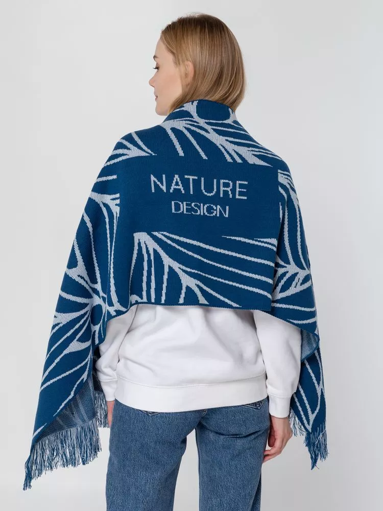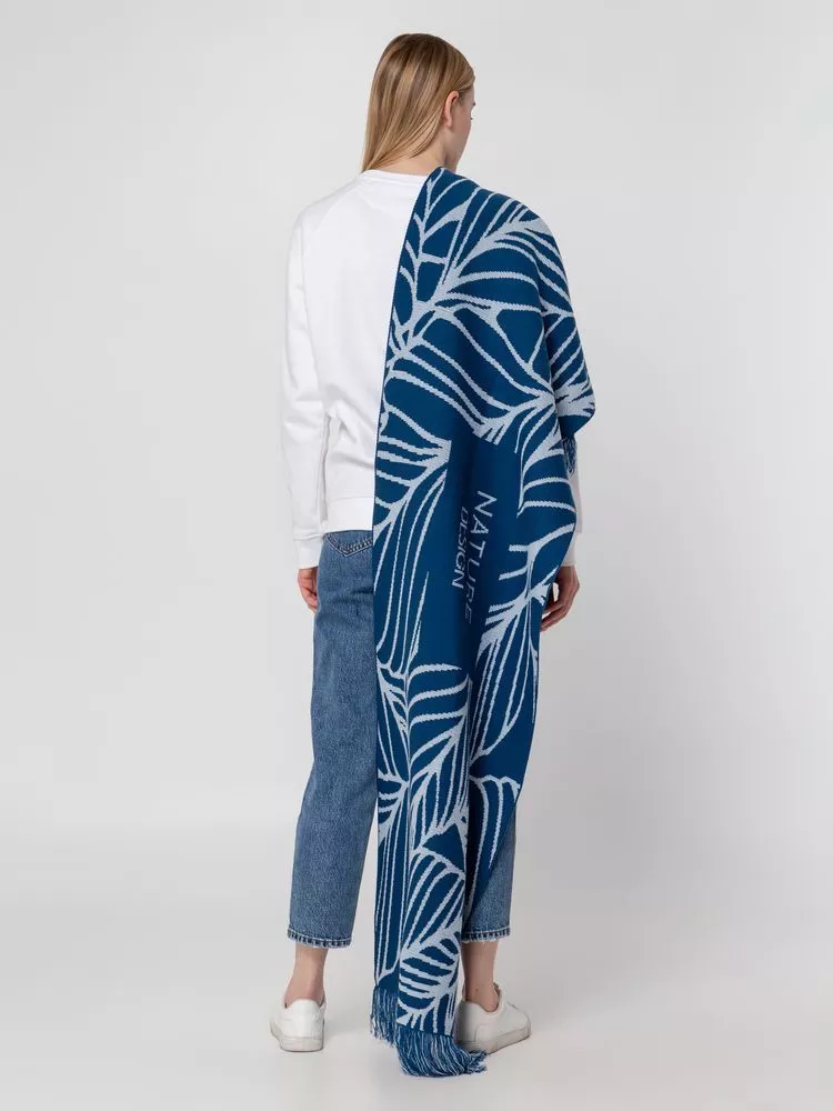 Палантин с пестрой бахромой с вывязанным логотипом и индивидуальным рисунком в фирменной цветовой гамме.