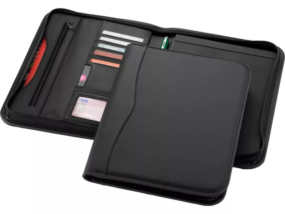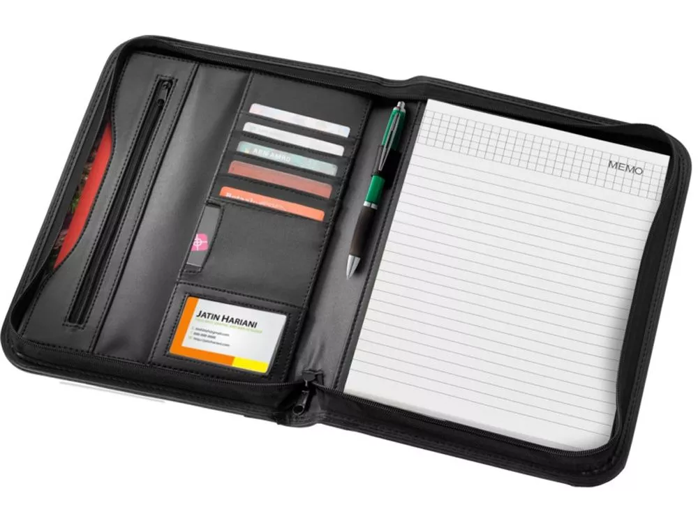 Папка с застежкой-молнией, держателем для ручки, карманом на молнии, отделениями для документов и блокнотом с 20 страницами линованной бумаги. Ручка и принадлежности не включены.