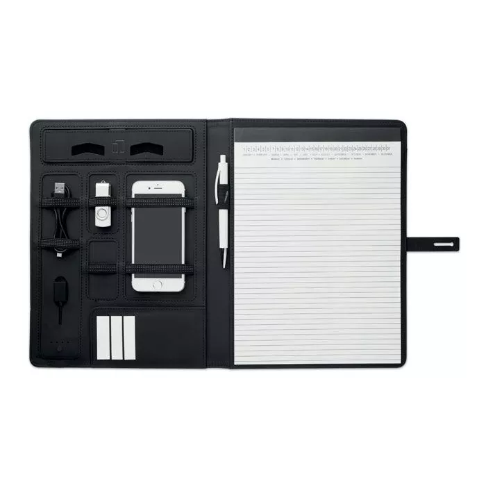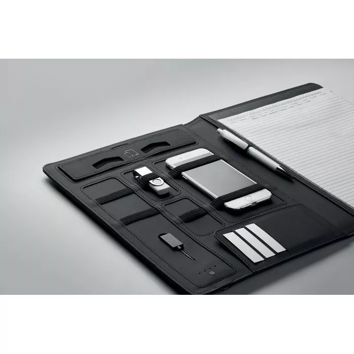 Конференц папка A4 с тканевой отделкой на застежке. Внутри беспроводная зарядка DC5V / 1A и аккумулятор 4000 мАч. В комплекте микро-USB с разъемом тип C. Есть блокнот для записей на 20 стр. Множество кармашков.