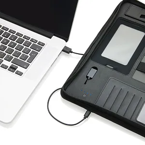 Папка для документов Tech со встроенным аккумулятором емкостью 4 000 мАч отлично подойдет для людей с активной жизненной позицией. Кроме основных функций она сочетает в себе еще и подставку для телефона / планшета, держатель для телефона с прозрачным окошком для просмотра информации и доступа к устройству, а также несколько держателей для гаджетов. Входное напряжение 5 В/800 мАч, выходное напряжение 5 В/2,1 А.