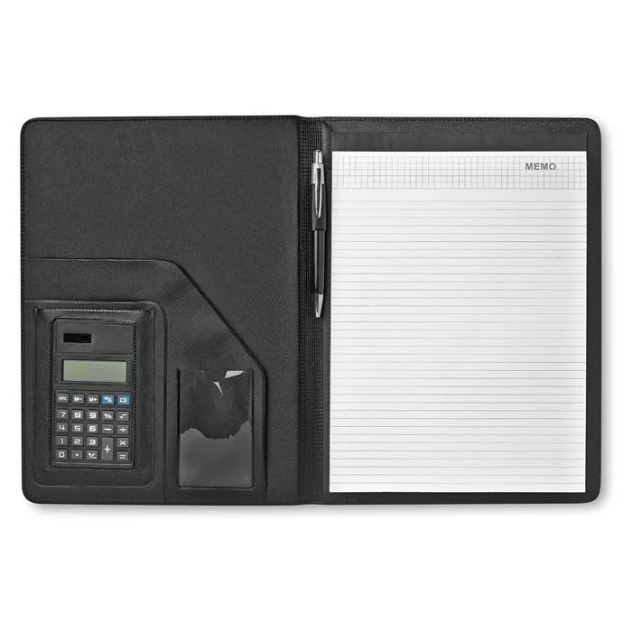 Папка А4 из искусственной кожи с калькулятором на солнечных батарейках, синей шариковой ручкой и блокнотом