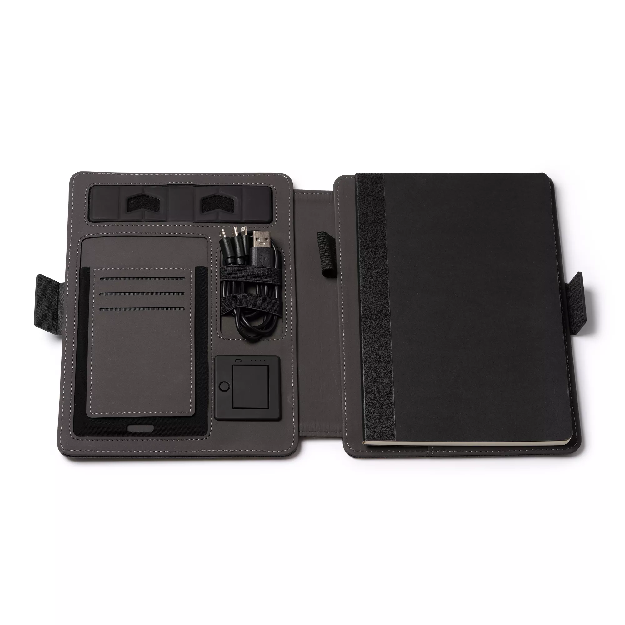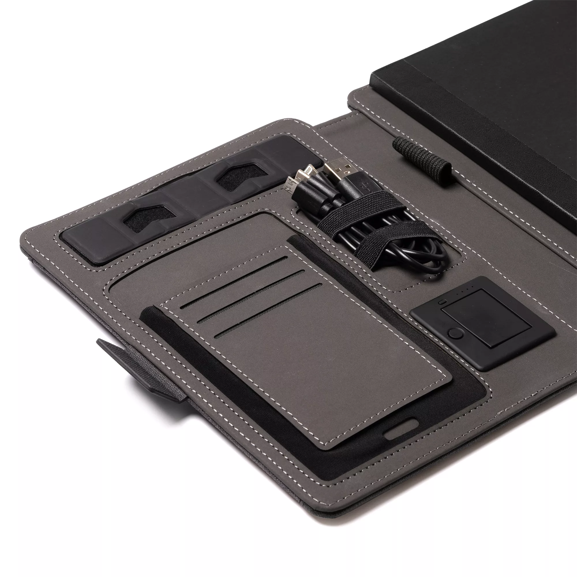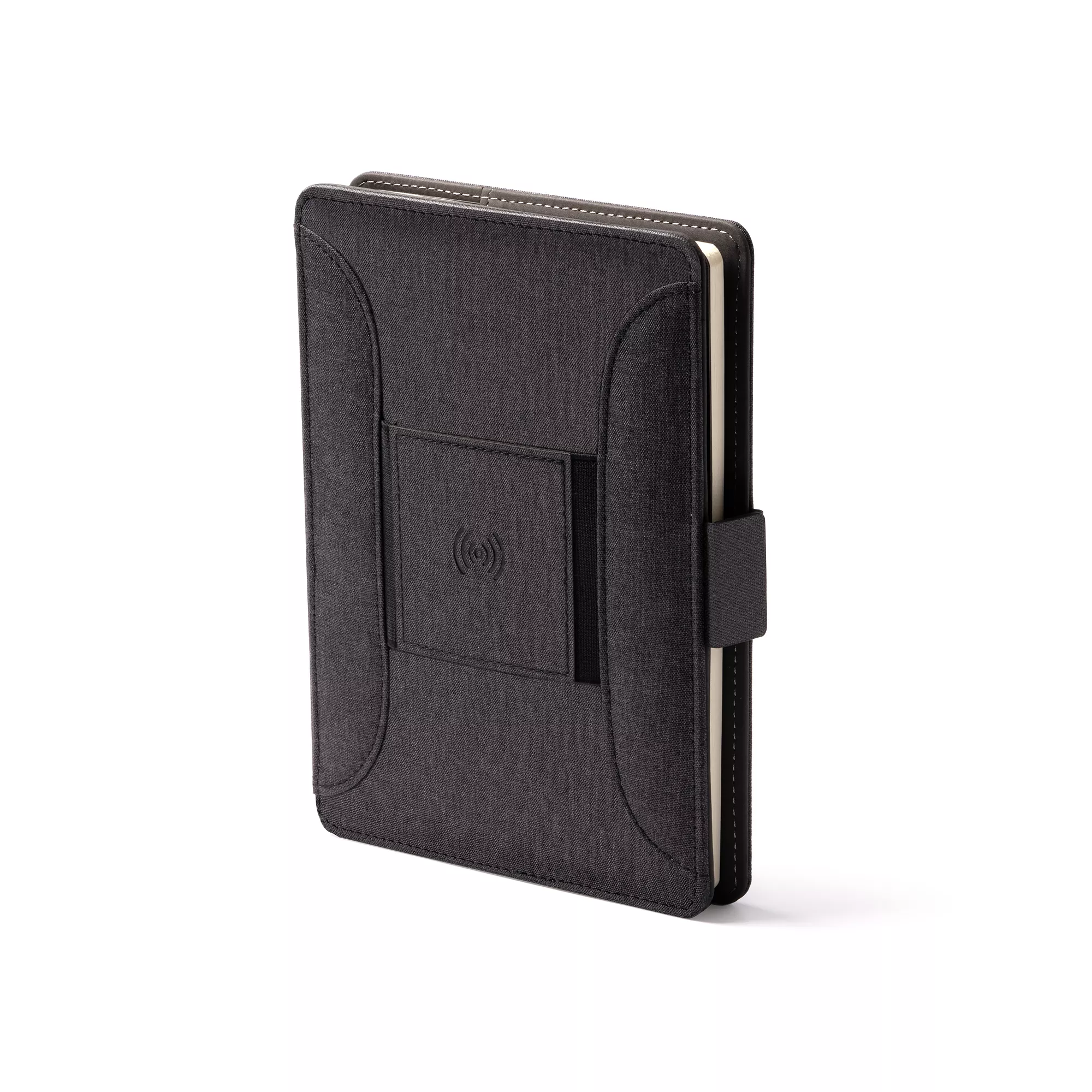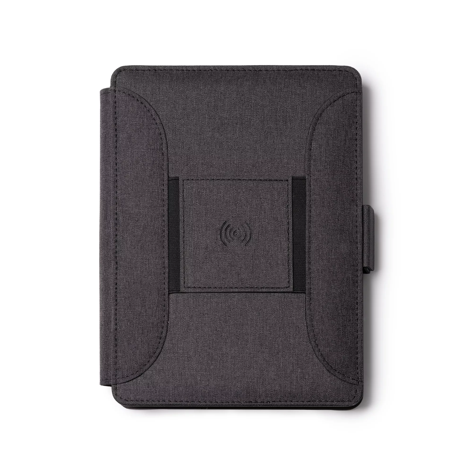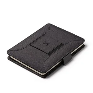 Многофункциональная папка формата А5 RPET 300D — универсальный и практичный аксессуар, позволяющий систематизировать документы. Магнитный замок, беспроводная зарядка, съемный блокнот на 56 листов, кармашек для мобильного, держатель для карт, ручек и мобильного. Кроме того, в комплект входит кабель с 3 входами (тип C и выход USB)
