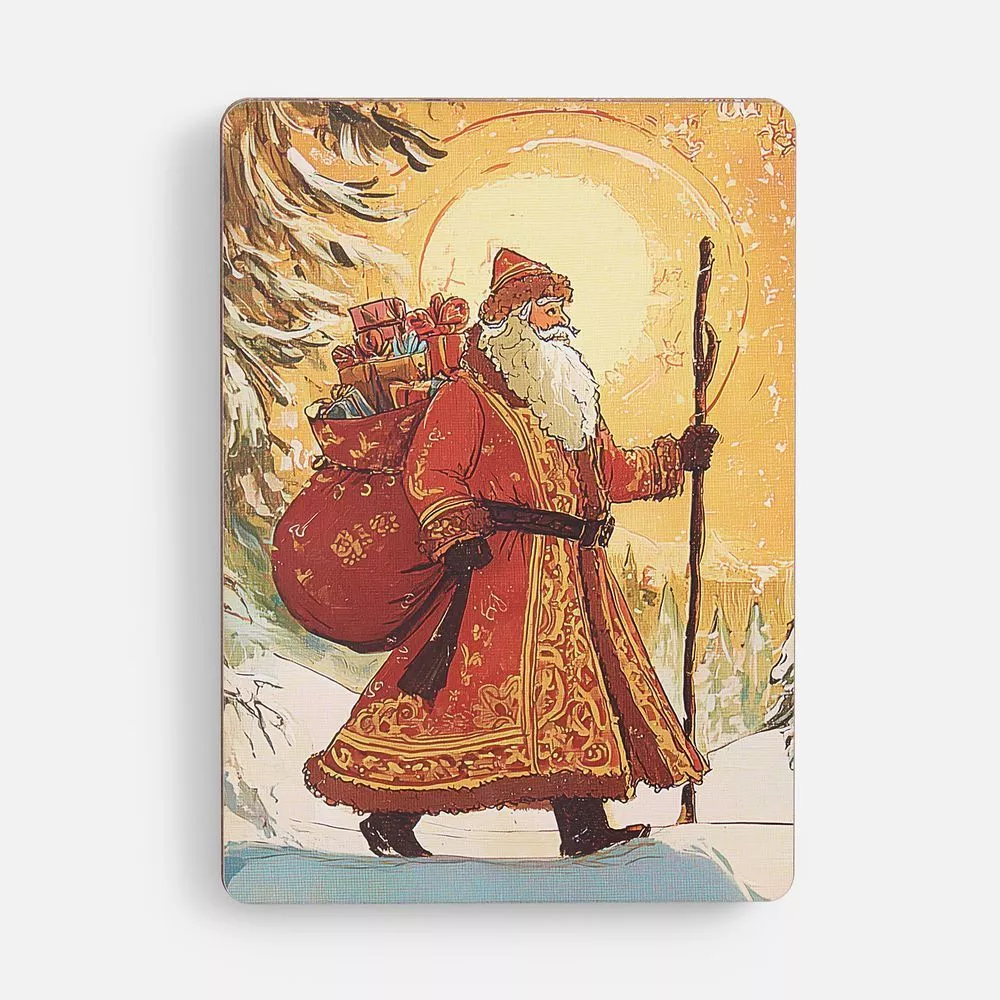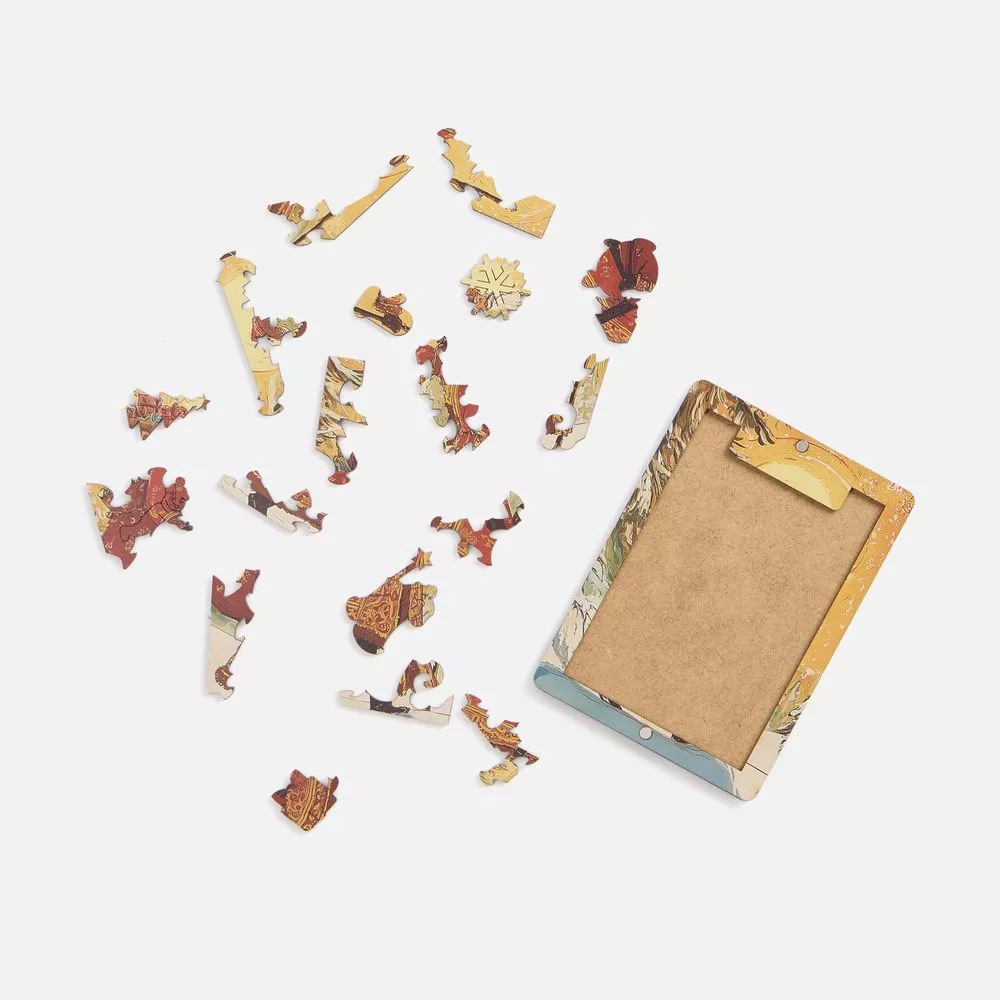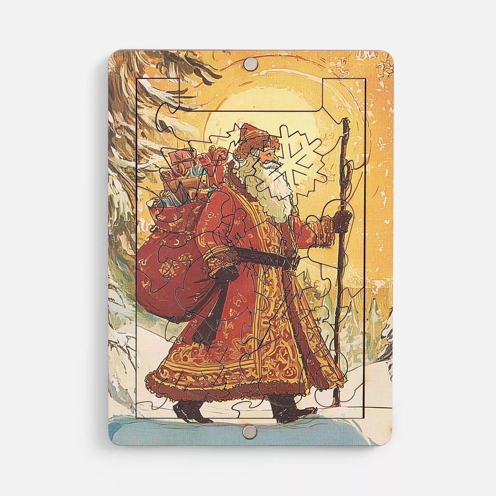 Пазлы изготовлены из дерева, а сама новогодняя картинка оформлена в открыточном ретростиле. В центре композиции — величественный Дед Мороз с богатым мешком подарков, символизирующий радость Нового года. Это не просто подарки, но и наступающий год, щедрый на все самое хорошее: радость, достаток и впечатления.