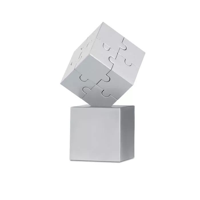 Металлический ЗD паззл в форме куба, собирается из восьми намагниченных элементов. Металлическое основание.