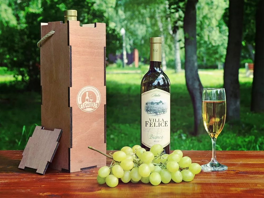 Подарочный пенал для упаковки бутылок, изготовлен из экологически чистых материалов. В него легко можно поместить винную или любую другую бутылку. Внутри пенала для алкоголя находится деревянная стружка, которая служит как для декора, так и для сохранности подарка. Деревянная коробка-пенал подчеркнет эстетическую значимость вашего сувенира. Она проста в использовании, крышка упаковки легко закрывается надежно фиксирует бутылку. Таким образом, ваш презент переходит из обычного подарка в разряд премиум и приобретает благородный и презентабельный вид. Материал пенала: тонированная шлифованная березовая фанера толщиной 6 мм. Гравировка (CO2 лазер) (Без чернения) на данный товар осуществляется бесплатно. Оплачивается только настройка оборудования в размере 1000 рублей на весь тираж.