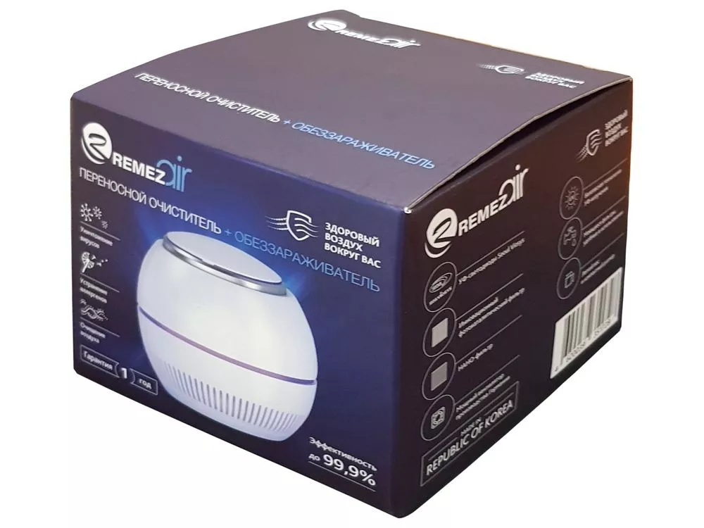 Переносной очиститель + обеззараживатель от REMEZair благодаря эффективной УФ-стерилизации уничтожает до 99,9% всех известных вирусов и бактерий (вкл. COVID). Также удаляет аллергены (пыльцу, шерсть и перхоть животных, пыль и споры плесени), поглощает запахи, формальдегиды и прочие летучие органические соединения. Инновационный прибор REMEZair обладает многоступенчатой системой фильтрации – НАНО-фильтр, керамический фильтр, фотокаталитический фильтр, инновационные УФ-светодиоды от южнокорейской компании Seoul Viosys. Срок службы применяемых высококачественных ультрафиолетовых светодиодов от южнокорейской компании Seoul Viosys составляет 50000 ч. Метод УФ-стерилизации в приборах REMEZair эффективен в борьбе с вирусами и абсолютно безопасен для человека. Мощный вентилятор, произведенный в Германии, обеспечит оптимальную циркуляцию воздуха для максимально эффективной дезинфекции. Стильный и компактный прибор можно использовать не только в помещении, на рабочем столе, но и в машине. Питание прибора возможно как напрямую от micro-USB, так и от портативного аккумулятора. REMEZair – Здоровый Воздух Вокруг Вас! Тампопечать (1 цвет (белые изделия)) на данный товар осуществляется бесплатно. Оплачивается только настройка оборудования в размере 7300 рублей на весь тираж.