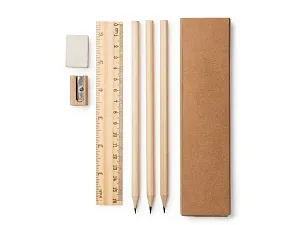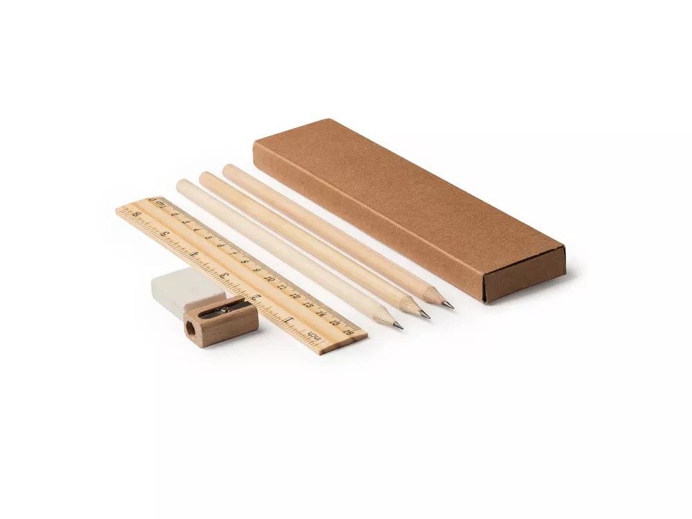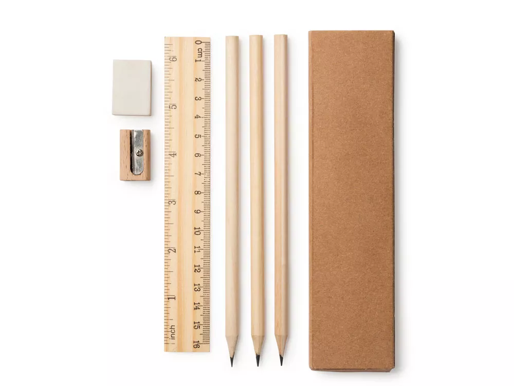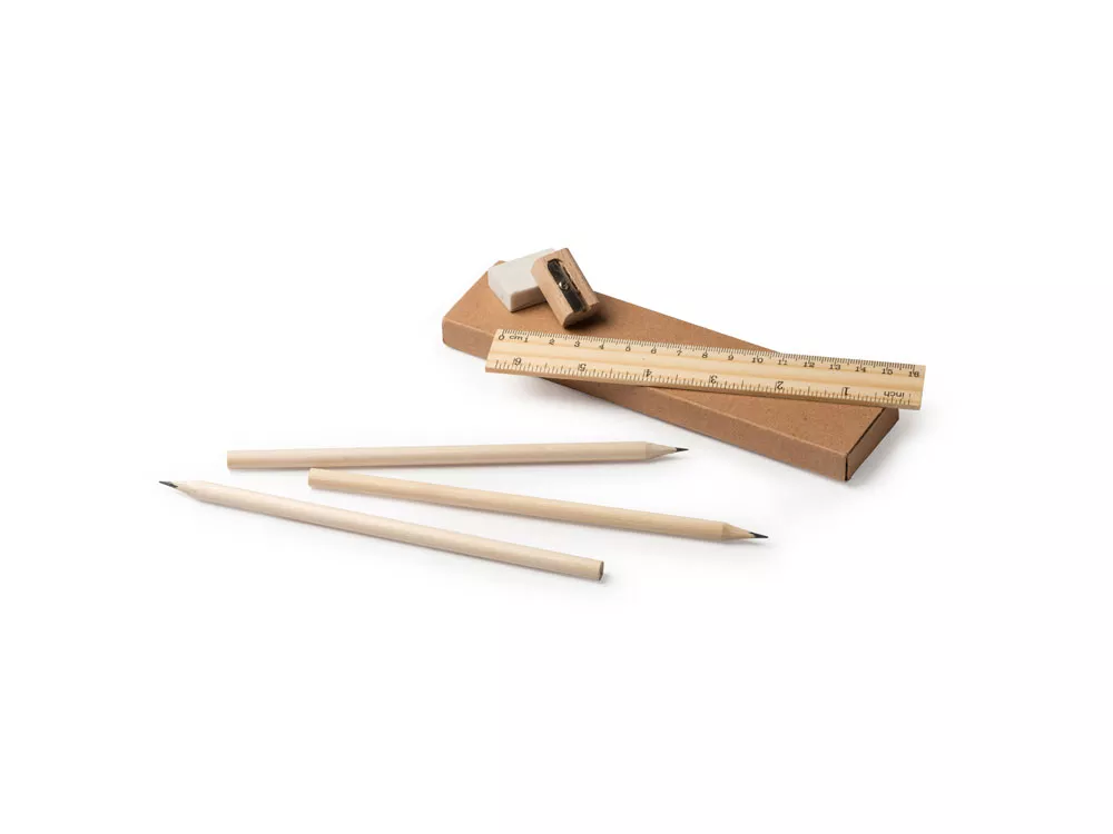 Письменный набор из натурального дерева в картонной коробке. В комплекте линейка, 3 карандаша, 1 ластик и 1 точилка.