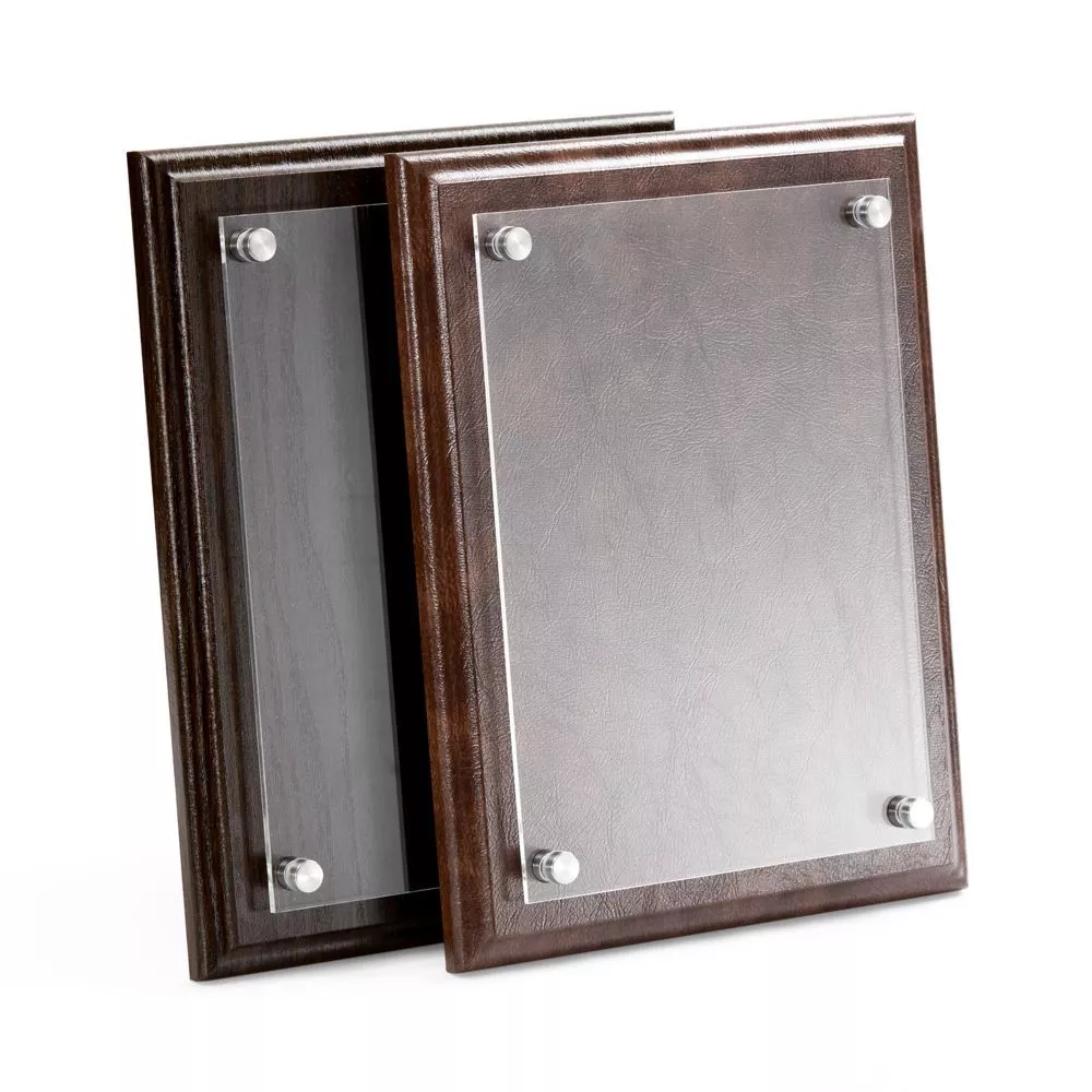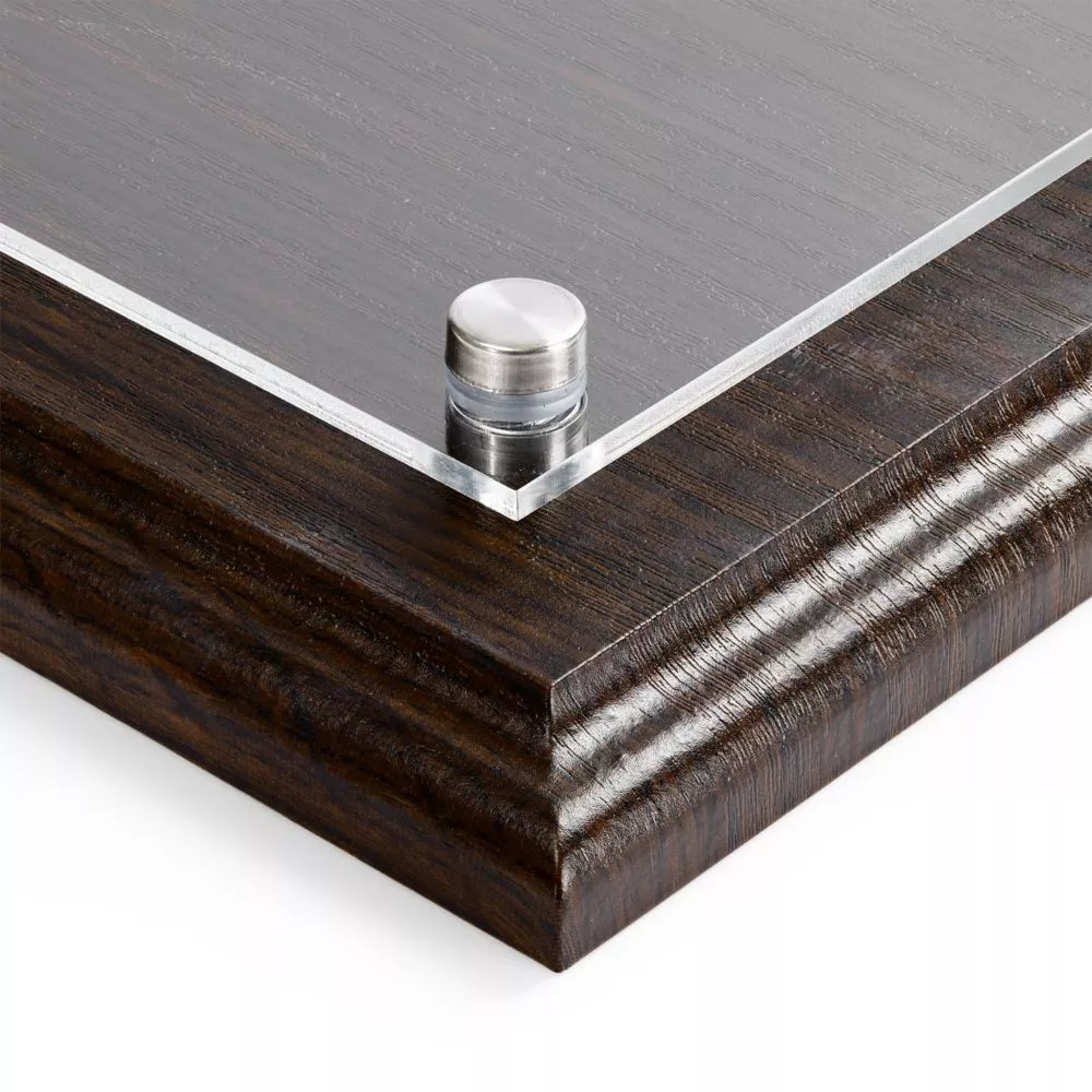 Классическая плакетка с деревянной основой под черное дерево и акриловой вставкой — универсальный инструмент, чтобы рассказать об успехах команды.