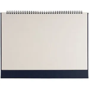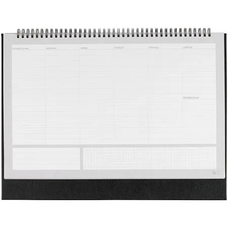 Настольный недатированный планер на открытой пружине. Обложка из белого мелованного картона, подложка из плотного картона в материале Petrus, тёмно-синий XX.