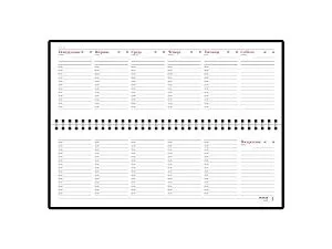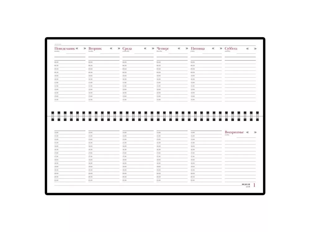 Недатированный планинг выпускается размером 305*130 мм и содержит 128 страниц (блок 292 х100 мм). Для них выбрана высококачественная белая бумага плотностью 70 грамм. Разворот представляет собой разметку на 7 дней недели с графами с указанием времени. Месяц и день недели указаны на русском и английском языках. Первые 15 страниц содержат справочные сведения из различных областей на русском языке. Крепление листов на открытом гребне способствует быстрому переходу по страницам. Современная, практичная обложка из приятного на ощупь материала с легким прорезиненным эффектом хорошо подходит для тиснения. Декоративная прострочка нитью в тон подчеркивает закругленную форму обложки.