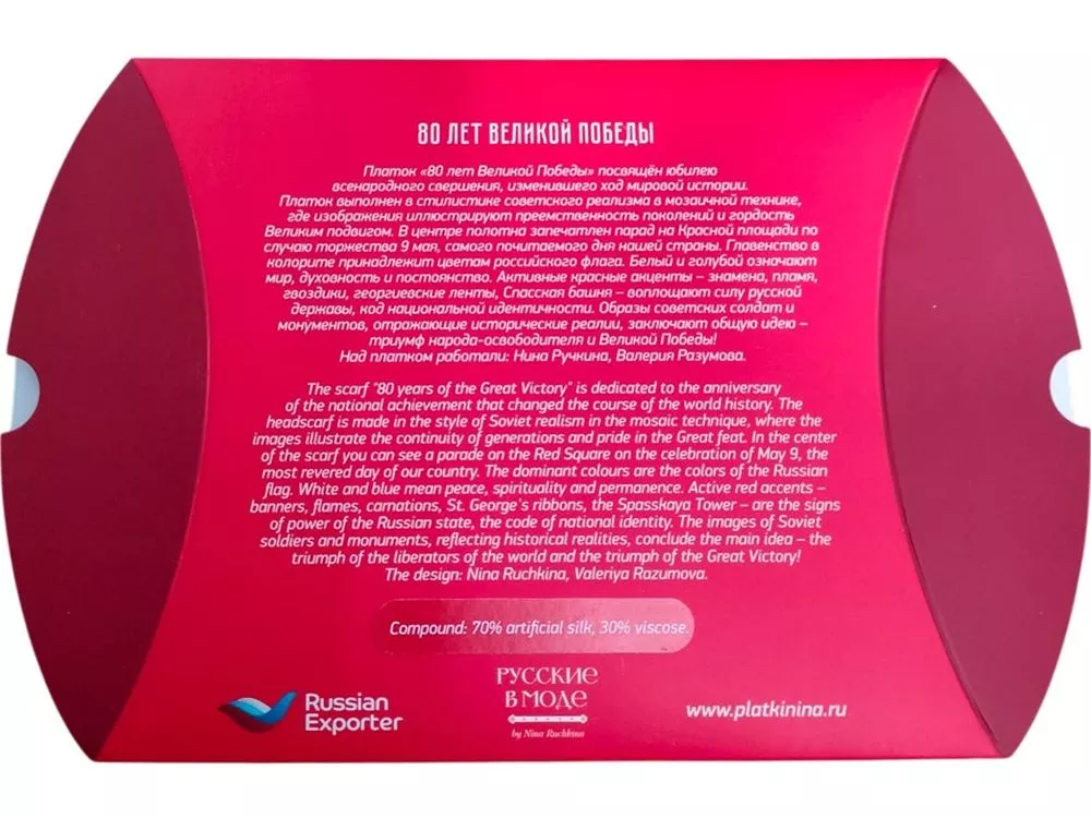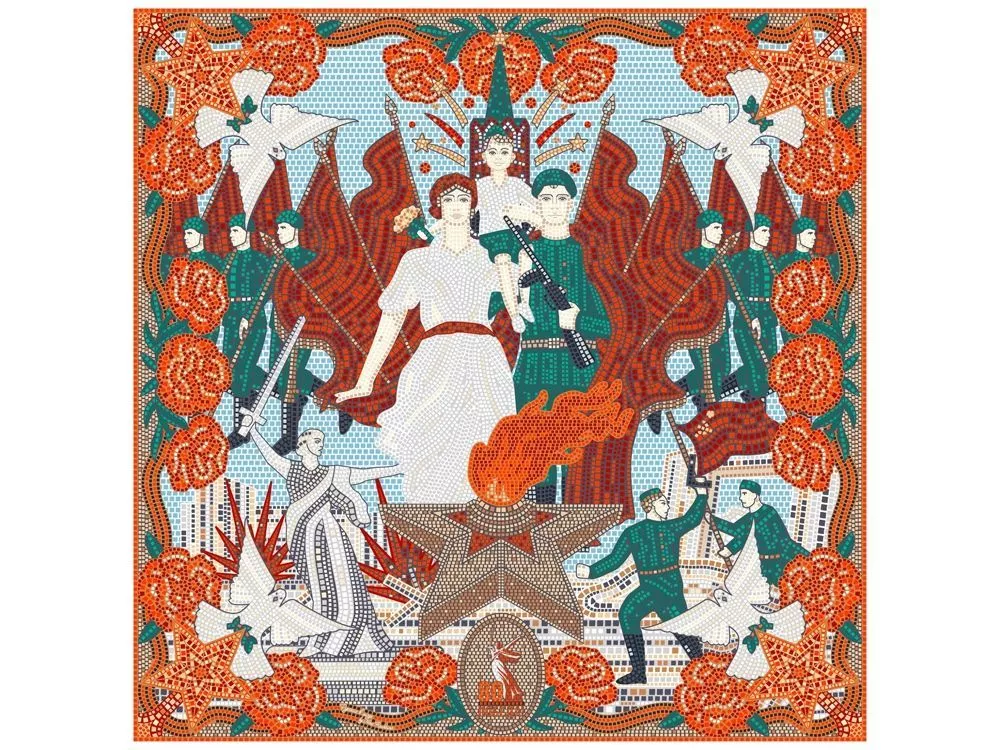 Платок 80 лет Великой Победы посвящён юбилею всенародного свершения, изменившего ход мировой истории. Дизайн выполнен в стилистике советского реализма в мозаичной технике, где изображения иллюстрируют преемственность поколений и гордость Великим подвигом. В центре полотна запечатлен парад на Красной площади по случаю торжества 9 мая, самого почитаемого дня нашей страны. Главенство в колорите принадлежит цветам российского флага. Белый и голубой означают мир, духовность и постоянство. Активные красные акценты – знамена, пламя, гвоздики, георгиевские ленты, Спасская башня – воплощают силу русской державы, код национальной идентичности. Образы советских солдат и монументов, отражающие исторические реалии, заключают общую идею – триумф народа-освободителя и Великой Победы! Художники: Нина Ручкина, Валерия Разумова.