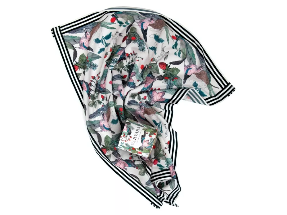 Платок из искусственного шелка саржевого плетения (твил) размером 70*70 см., с авторским принтом Фазаны. Принт нарисован художницей вручную специально для бренда Varvara. Художница размышляла на тему русской природы, культуры и искусства - тут и лесная земляника, и сочная зелень, и сказочные зайцы с фазанами. Композиция рисунка, выполненная в стиле иллюстраций к русским сказкам, переносит нас в атмосферу сказочного леса. Платок упакован в подарочный тубус. Бережный уход. Ручная стирка при температуре не выше 30 градусов.