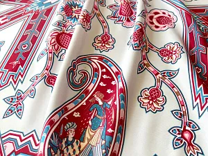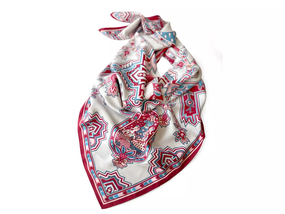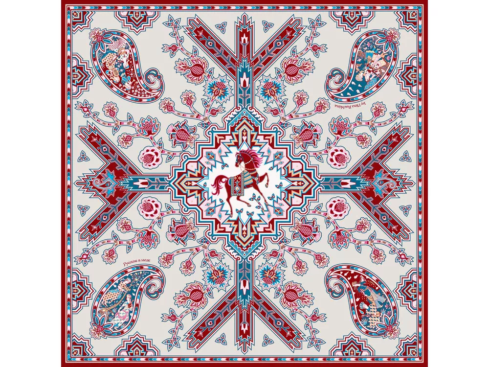 Дизайн платка Кавказский скакун от бренда Русские в моде by Nina Ruchkina навеян прекрасным и загадочным Востоком, вдохновляющим творцов всего мира. В центре принта аксессуара изображена гордая лошадь - один из главных символов величественного Кавказа, ассоциирующийся с дивной красотой, силой, смелостью и огнём. Изящный скакун окружён бутой - языками пламени, роскошными цветами плодородного граната, изящно простирающимися меж колоритного орнамента знаменитых восточных ковров. В каждом элементе буты можно увидеть национальные промыслы и традиционные музыкальные инструменты — лютню (удд), бубны, почитаемые народами дивного Востока. Этот платок идеально подойдет амбициозным, целеустремленным и уверенным в себе девушкам, стремящимся сделать каждый свой образ неповторимым! Дизайн: Нина Ручкина, Наталия Александрова.