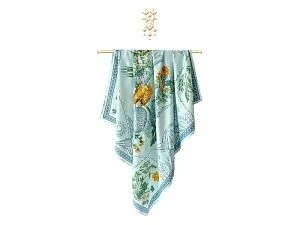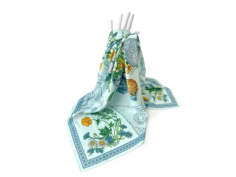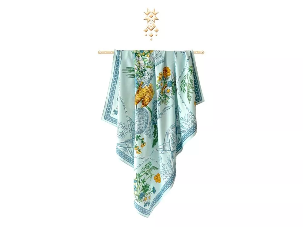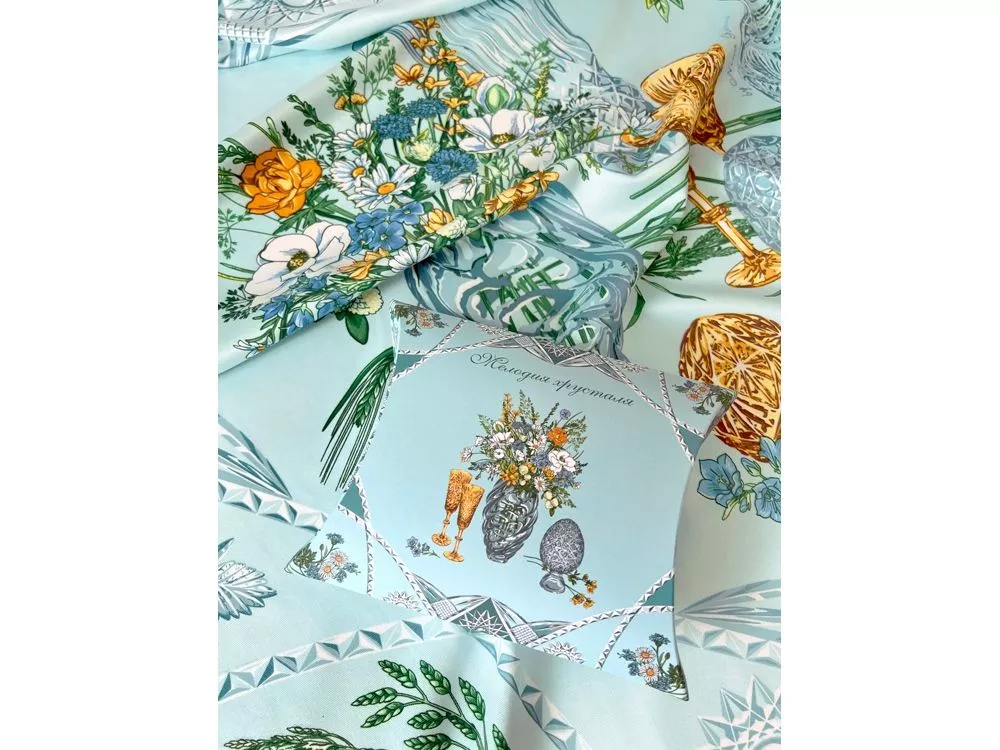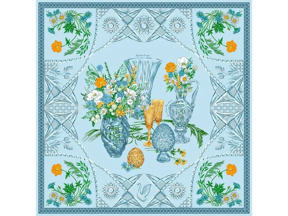 Платок Мелодия хрусталя создан в содружестве с легендарным Гусевским хрустальным заводом, выпускающим всемирно известные произведения искусства. Дизайн платка связан со стилевой эстетикой советской школы натюрморта. Перед нами ажурная скатерть стола, декорированного композицией из хрусталя и полевыми цветами. Нежные переливы сине-голубых тонов подчеркнуты ярко-желтыми и белыми бутонами, стеблями сочных трав и золотистыми бокалами. Ажур скатерти вторит хрустальному узору фужеров, ваз и сувенирных пасхальных яиц, задавая душевное настроение. Вам обязательно захочется насладиться вдохновляющей нотой платка Мелодия хрусталя и сделать его главным акцентом вашего образа.