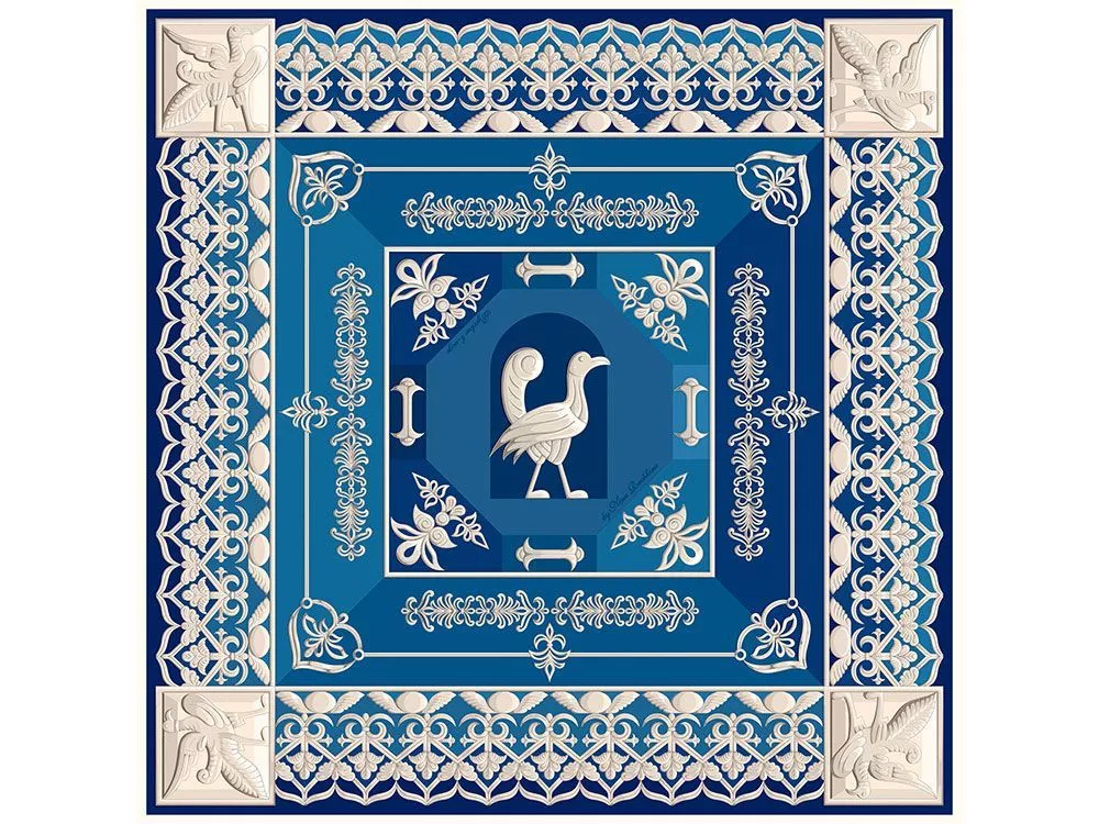 В древнерусском искусстве образ птицы довольно распространён. Птица символизирует святость, рай, бессмертие, духовную сферу, воздушную стихию, лёгкость и полёт. В знаменитой на весь мир белокаменной резьбе суздальских и владимирских соборов рельефы с изображениями птиц встречаются часто. Среди них есть и сказочные образы, и вполне реальные, например, орел, голубь, павлин, фазан, гуси… Часто у птичьих пар переплетены шеи, крылья,хвосты, что, вероятно, знаменует собой единение. Надеемся, что этот замечательный платок напомнит вам творчество наших талантливых предков, рельефы белокаменного зодчества Северо-Восточной Руси и поможет вашей душу воспарить, как птицы, на нем изображенные. Дизайн платка разработан брендом Русские в моде by Nina Ruchkina при сотрудничестве с Владимиро-Суздальским музеем-заповедником. Эскиз выполнили дизайнер Нина Ручкина и художник Полина Зыкова. Надеемся, результат творческого союза порадует вас оригинальностью, выразительностью и красотой, и станет настоящей изюминкой в создании вашего образа.2 Над дизайном работали: Нина Ручкина, Полина Зыкова.