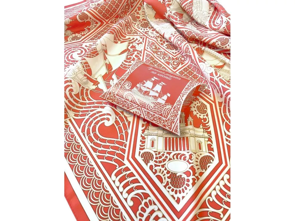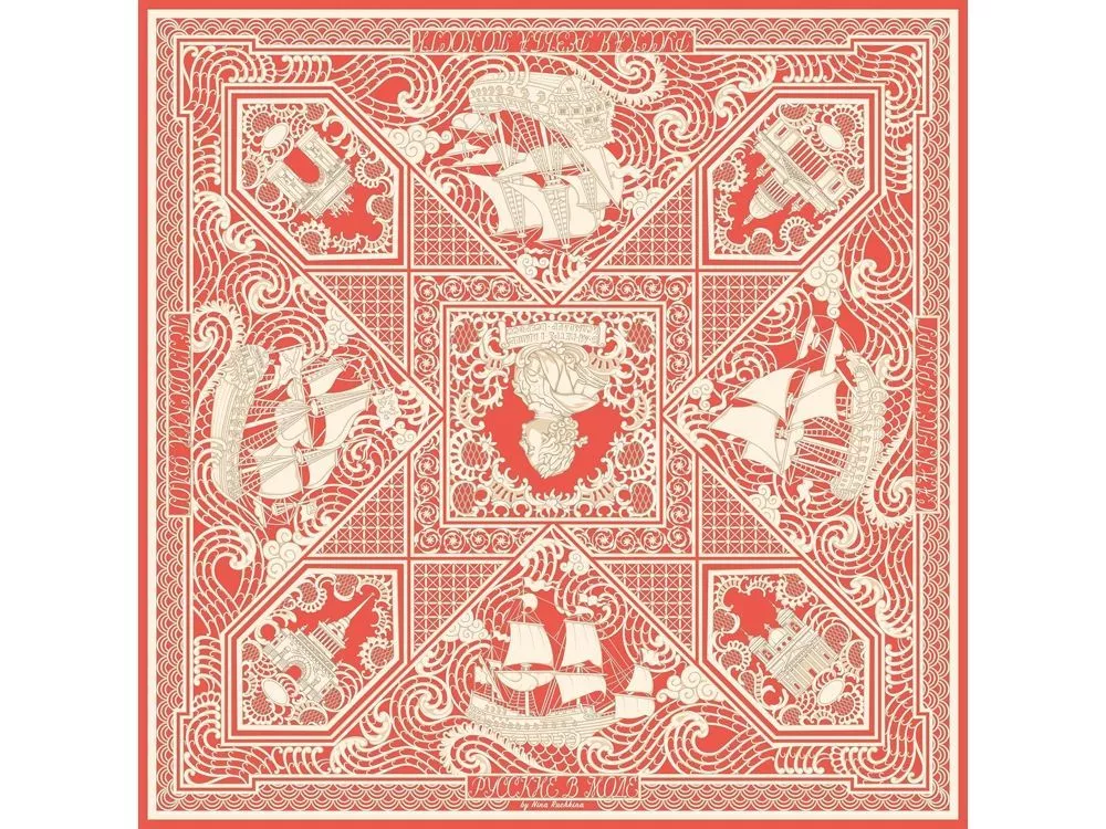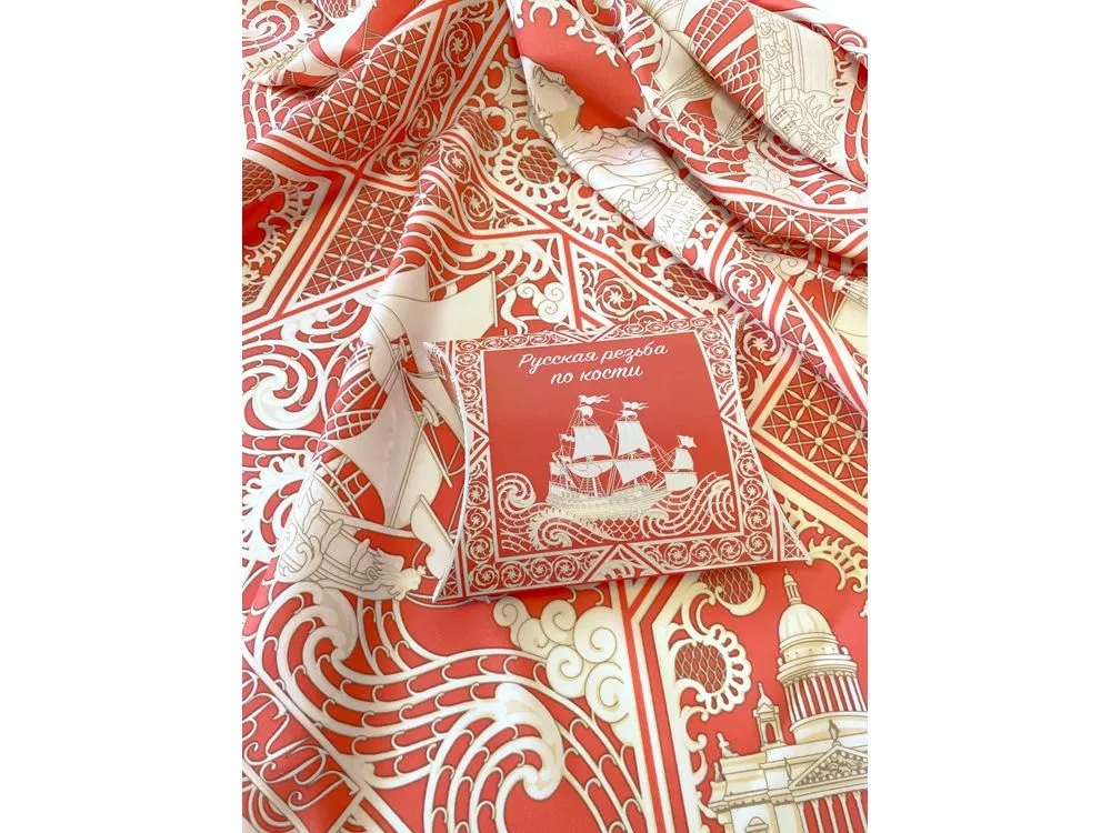 Дизайн посвящён чрезвычайно редкому и сейчас уже почти забытому косторезному искусству. Музеи мира хранят великолепные образцы ларцов, шкатулок, миниатюрных шкафчиков, выполненных в технике ажурной холмогорской резьбы по кости. Тематика платка - Петровский Флот. В центре - декоративная резная пластина в пышном обрамлении с профилем великого русского самодержца Петра I. По углам - резные вставки с узнаваемыми архитектурными шедеврами Петербурга разных времён: Нарвские триумфальные ворота, Здание Главного адмиралтейства, Троицкий собор Александро-Невской лавры, Исаакиевский собор. Дополняют композицию петровские фрегаты, раскачивающиеся на волнах ажурного кружева. Платок Русская резьба по кости совмещает в себе традиции виртуозных мастеров и отвечает запросам нашего времени. В изысканный и модный аксессуар вплетена история, а сам по себе он является модным акцентом в образе современной девушки.