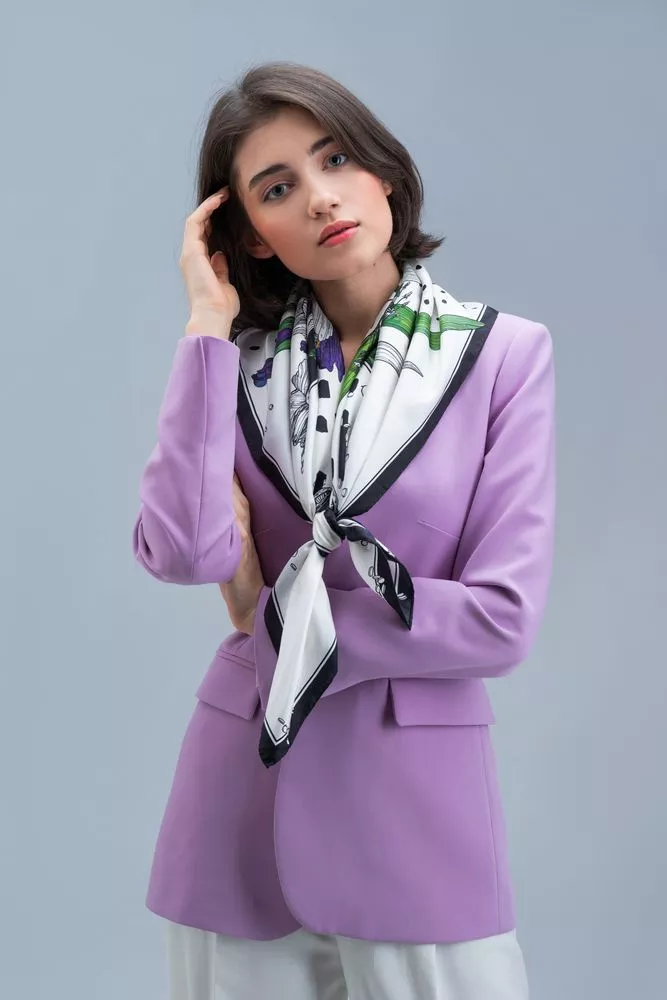 Шелковый платок с цветочным принтом открывает простор фантазии — его можно использовать как шарф, головной убор или декоративный элемент для верхней одежды и аксессуаров.