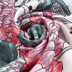 Шелковый платок с цветочным принтом открывает простор фантазии — его можно использовать как шарф, головной убор или декоративный элемент для верхней одежды и аксессуаров.