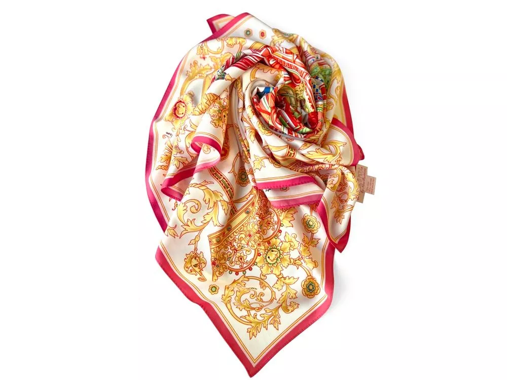 Скопище маленьких, разной высоты, башенок, составляющих вместе куст, букет цветов… или, еще лучше разноцветный кристалл, ярко сверкающий своими гладкими гранями в солнечных лучах…. Это слова французского путешественника Кюстина Астольфа, который посвятил книгу истории России 1839 года и очень точно описал знаменитый Собор Василия Блаженного. Уникальный памятник архитектуры был возведен в честь победы Руси над Казанским ханством по приказу Ивана Грозного. Собор объединяет сразу 11 церквей с пестрыми куполами разной высоты, образующими четкую форму восьмиконечной Вифлеемской звезды — символа Богородицы. Сказочный вид собора отражен на золотом фоне новинки от бренда Русские в моде by Nina Ruchkina. Настоящее восьмое чудо Света обрамлено царскими коронами и райскими птицами, свидетельствующими об уникальности и роскоши этой исторической достопримечательности, отстроенной 1 октября 1552 года на праздник Покрова Богородицы. Мы искренне надеемся, что новый дизайнерский платок сделает ваш образ еще более благородным, ярким и впечатляющим. Пусть он подчеркивает вашу женственность, оберегает с Божьей помощью и привносит чудеса в вашу жизнь! Над дизайном работали: Нина Ручкина, Наталия Александрова.
