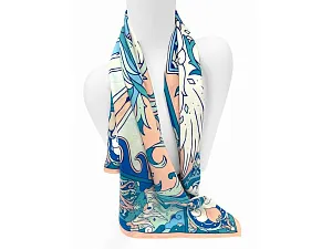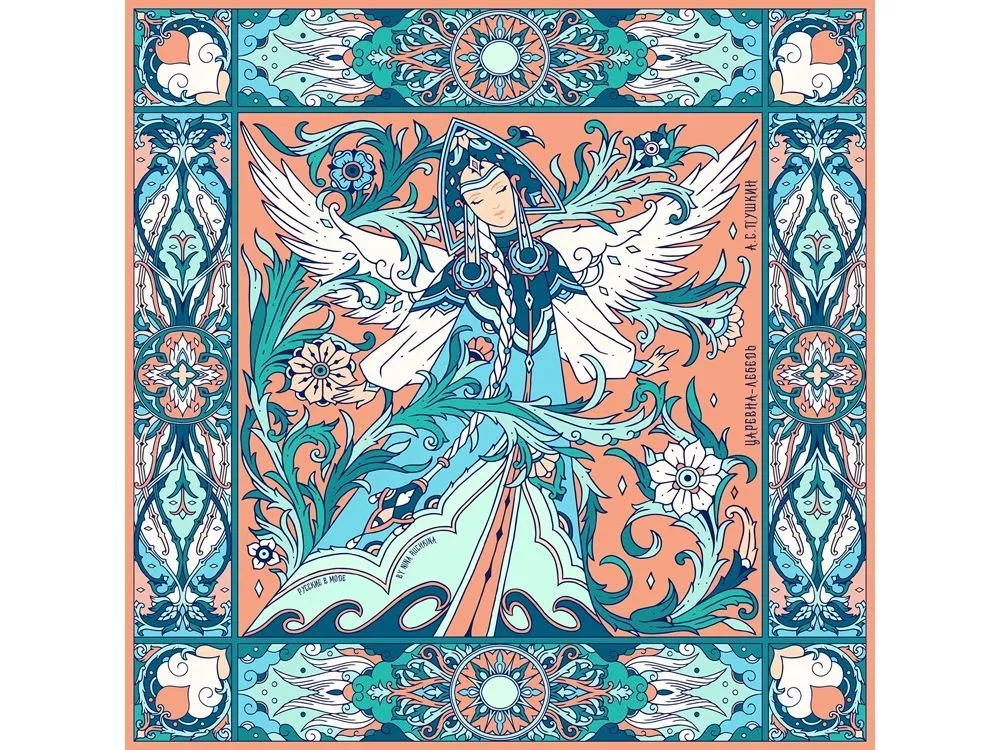 Дизайнерский платок Царевна Лебедь от Нины Ручкиной стал воплощением сказочного персонажа, прославленного великим и талантливым романтиком и поэтом — А. С. Пушкиным. Именно он впервые подарил нам образцы художественной русской эстетики, исходящей из самой глубины русской души. В центре авторского принта — удивительной красоты женщина с белоснежными крыльями, наделенная магическими способностями и житейской мудростью. Оригинальное сочетание тонов, цветочных орнаментов и русского колорита делают аксессуар нежным и самобытным. Платок с прекрасной Царевной Лебедь подойдет изящным и романтичным натурам, предпочитающим классику и традиционный русский стиль. Он станет деликатным дополнением как повседневного, так и вечернего образа утонченной леди.