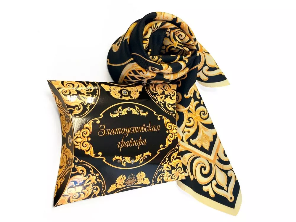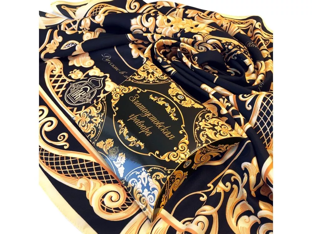 Дамы и господа, вы держите в руках платок Златоустовская гравюра, дизайн которого сделан совместно с авторами художественных мастерских Лик. Свыше 190 лет развивается и совершенствуется редкое искусство - Златоустовская гравюра на стали. Гравюра на стали - это поэма в металле. Художники, используя его чудесные свойства и применяя специальную обработку, придают стали различные цвета и создают уникальные изделия, прославляющие Россию на весь мир. Платок Златоуствоская гравюра от бренда Русские в моде - это роскошь, изящество и характер, оригинальный аксессуар и настроение праздника, который всегда с Вами. Над дизайном работали художники: Нина Ручкина, Ольга Балака.