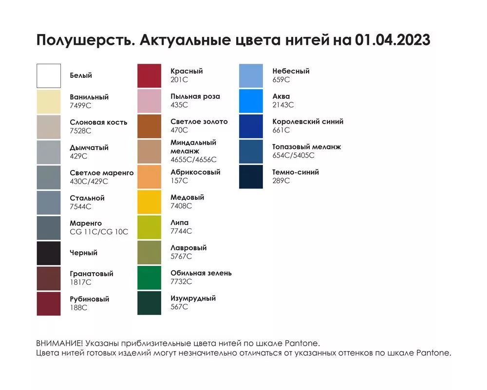 Цвет: выберите цветовое решение (1 цвет) по таблице «Актуальные цвета нитей» (на фото).