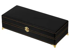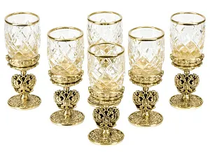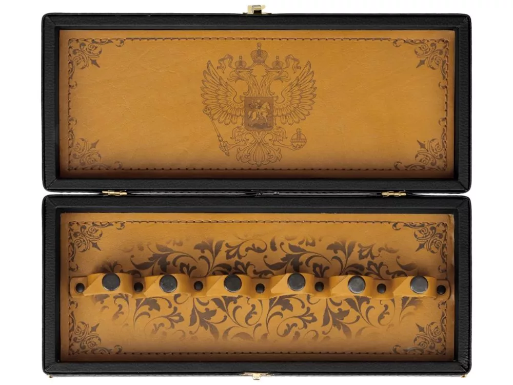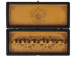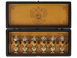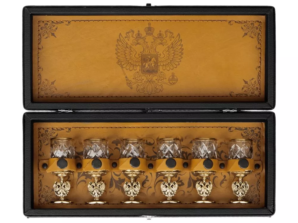 Футляр из эко-кожи, внутренняя отделка натуральная кожа рыжего цвета. Рисунок нанесен путем термообработки. В набор входит шесть стопок по 30 мл. Хрусталь, литьё.