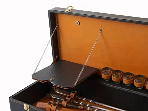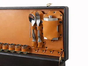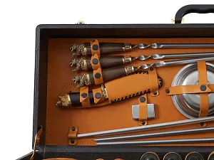 Кейс из сплит-кожи, с повышенной износостойкостью, внутренняя отделка натуральная кожа. Все аксессуары надежно крепятся к кейсу кожаными ремешками на кнопке, обеспечивая удобство транспортировки и сохранность содержимого. В комплект входит: - шампура большие- 6 шт - фляга 500 мл - фляга 250 мл - тарелка- 6 шт - вилка- 6 шт - ложка- 6 шт - стопка 25 мл- 6 шт - нож Тяпка - нож разделочный - зажигалка