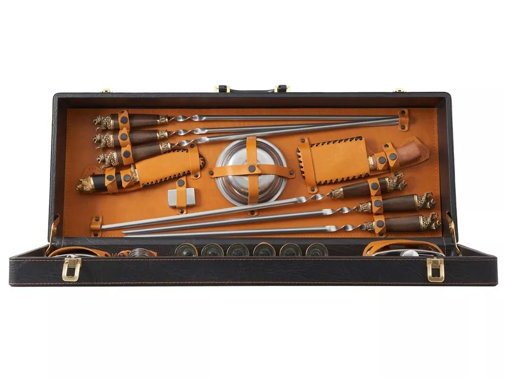 Кейс из сплит-кожи, с повышенной износостойкостью, внутренняя отделка натуральная кожа. Все аксессуары надежно крепятся к кейсу кожаными ремешками на кнопке, обеспечивая удобство транспортировки и сохранность содержимого. В комплект входит: - шампура большие- 6 шт - фляга 500 мл - фляга 250 мл - тарелка- 6 шт - вилка- 6 шт - ложка- 6 шт - стопка 25 мл- 6 шт - нож Тяпка - нож разделочный - зажигалка