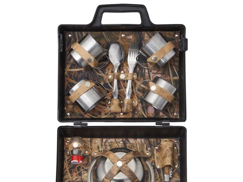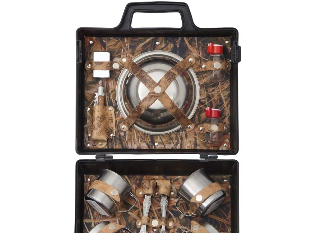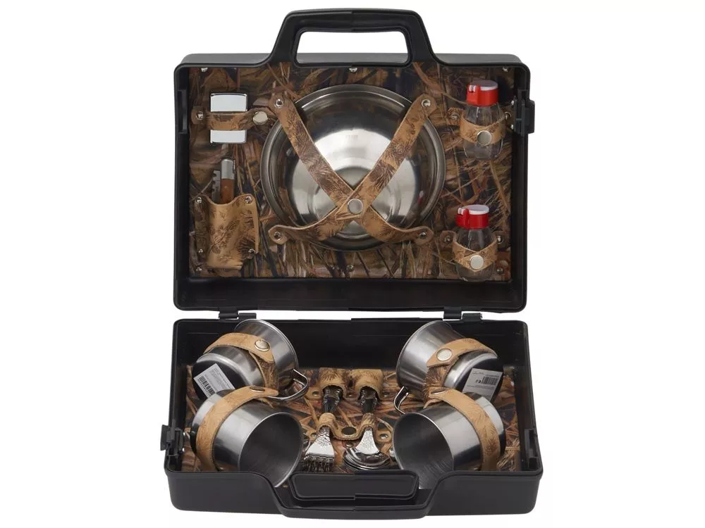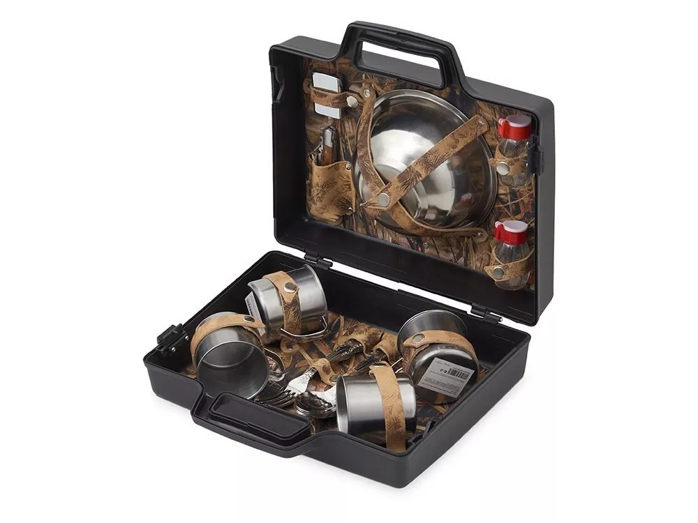 Погрузитесь в атмосферу комфорта и стиля с нашим подарочным набором. Этот тщательно подобранный комплект идеально подходит для тех, кто ценит качество и удобство во время отдыха на природе. В комплекте: - Кружки 200 мл. (нерж. сталь)- 4 шт - Вилки (нерж. сталь)- 4 шт - Ложки (нерж. сталь)- 4 шт - Тарелки 700 мл. (нерж. сталь)- 4 шт - Миска 1000 мл. (нерж. сталь)- 1 шт - Штопор- 1 шт - Зажигалка- 1 шт. - Емкости для соли и перца- 2 шт. Все аксессуары упакованы в пластиковый кейс и надежно закреплены ремешками из натуральной кожи, что обеспечивает удобство транспортировки и сохранность содержимого. Набор Походный – это идеальный выбор для похода на несколько дней, дружеской встречи или семейного отдыха на природе.