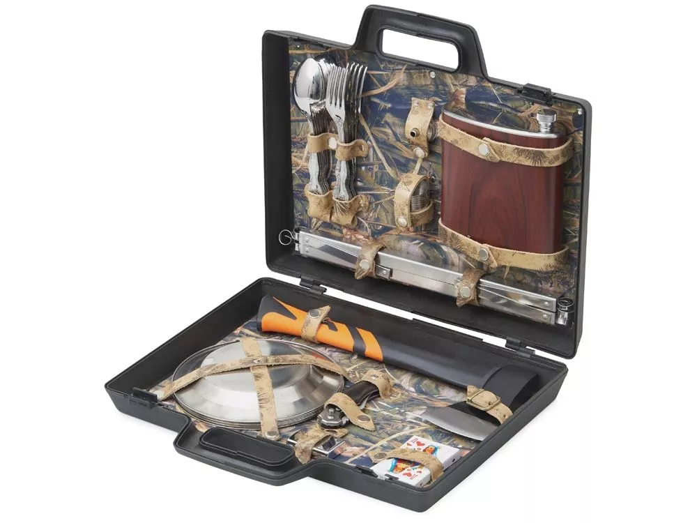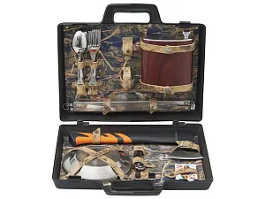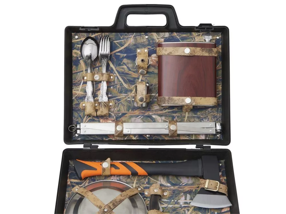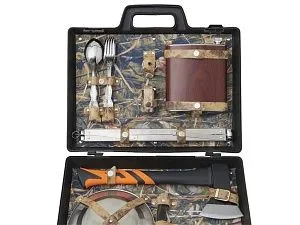 Идеальный комплект для активного отдыха на природе. Этот универсальный набор включает в себя все необходимое для комфортного пикника или кемпинга, обеспечивая вам удобство и стиль. В комплекте: - Тарелки (нерж. сталь)- 6 шт - Вилки (нерж. сталь)- 6 шт - Ложки (нерж. сталь)- 6 шт - Стопки (нерж. сталь)- 6 шт - Воронка для разлива - Топорик - Нож складной - Зажигалка - Складной мангал - Шампура- 6 шт - Фляжка - Колода игральных карт Все аксессуары упакованы в пластиковый кейс и надежно закреплены ремешками из натуральной кожи, что обеспечивает удобство транспортировки и сохранность содержимого.