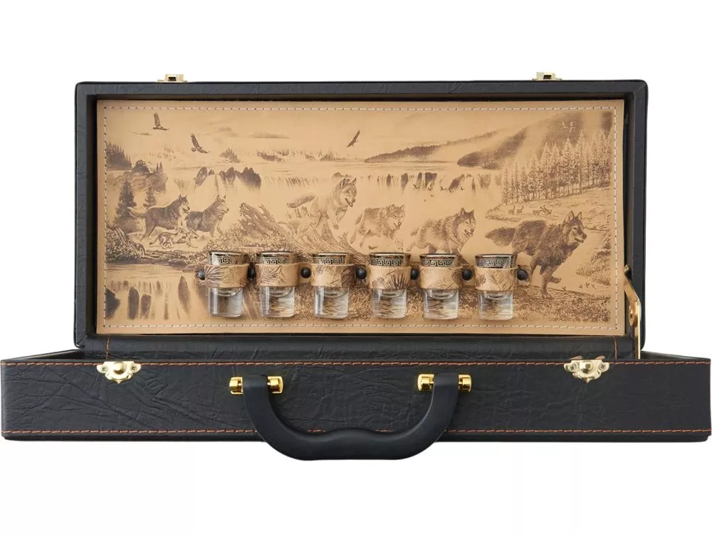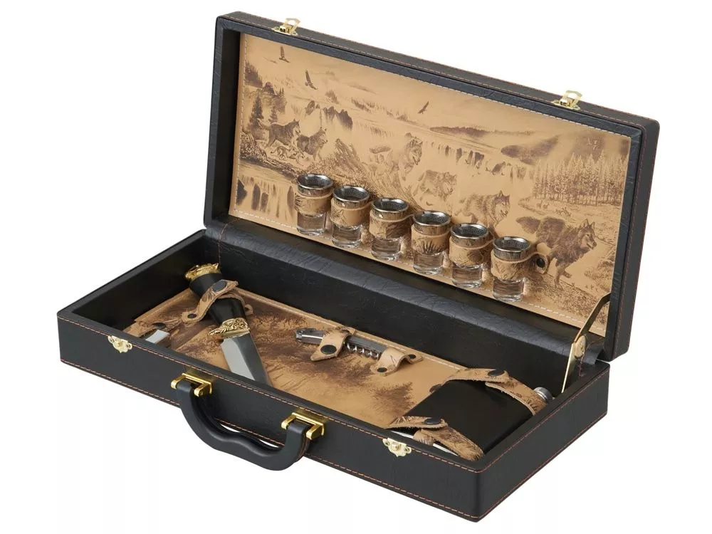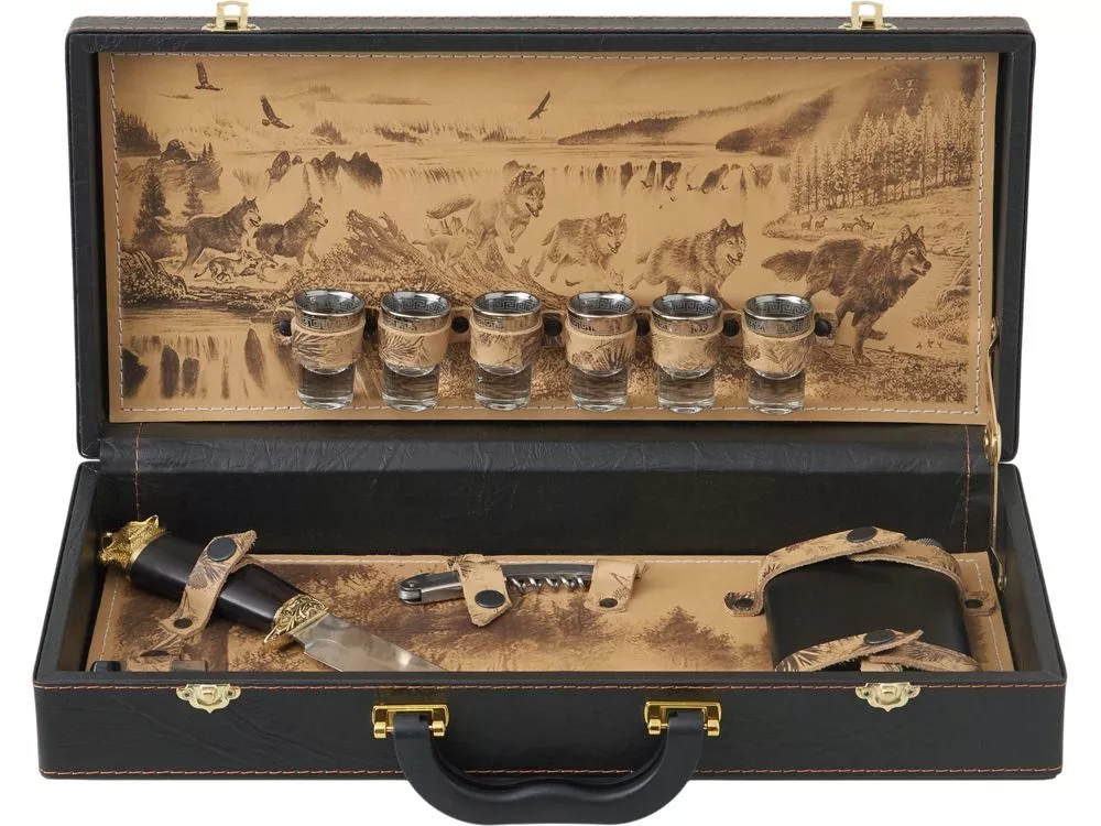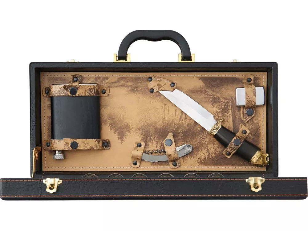 Погрузитесь в мир стиля и утонченности с нашим эксклюзивным подарочным набором. Этот тщательно подобранный комплект идеально подходит для тех, кто ценит качество и комфорт в своих приключениях. Все аксессуары упакованы в кейс из сплит-кожи, внутренняя отделка натуральная кожа с художественным выжиганием. Каждое изделие уникально, так как художественное выжигание может отличаться от представленного на фото, что придаёт набору особую индивидуальность. Все аксессуары надежно крепятся к кейсу кожаными ремешками на кнопке, обеспечивая удобство транспортировки и сохранность содержимого. В комплекте: - Фляжка 250 мл- 1 шт - Стопка (стекло) 25 мл- 6 шт - Штопор- 1 шт - Нож- 1 шт - Зажигалка- 1 шт