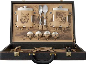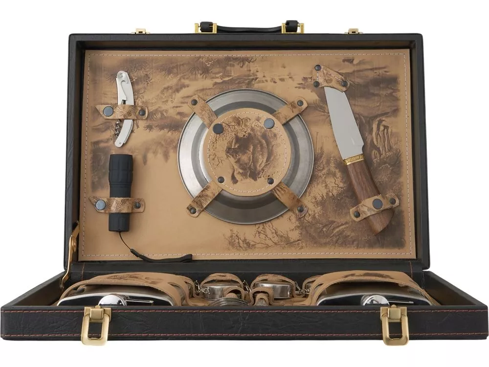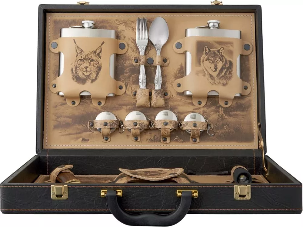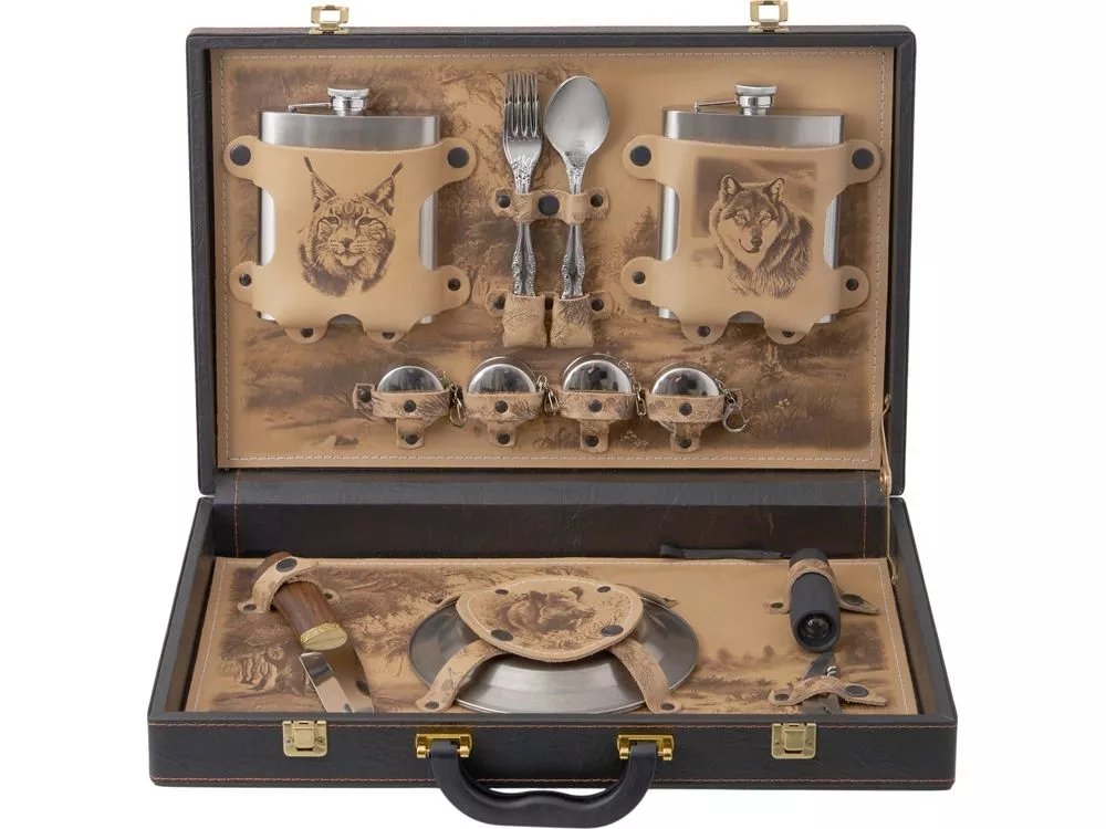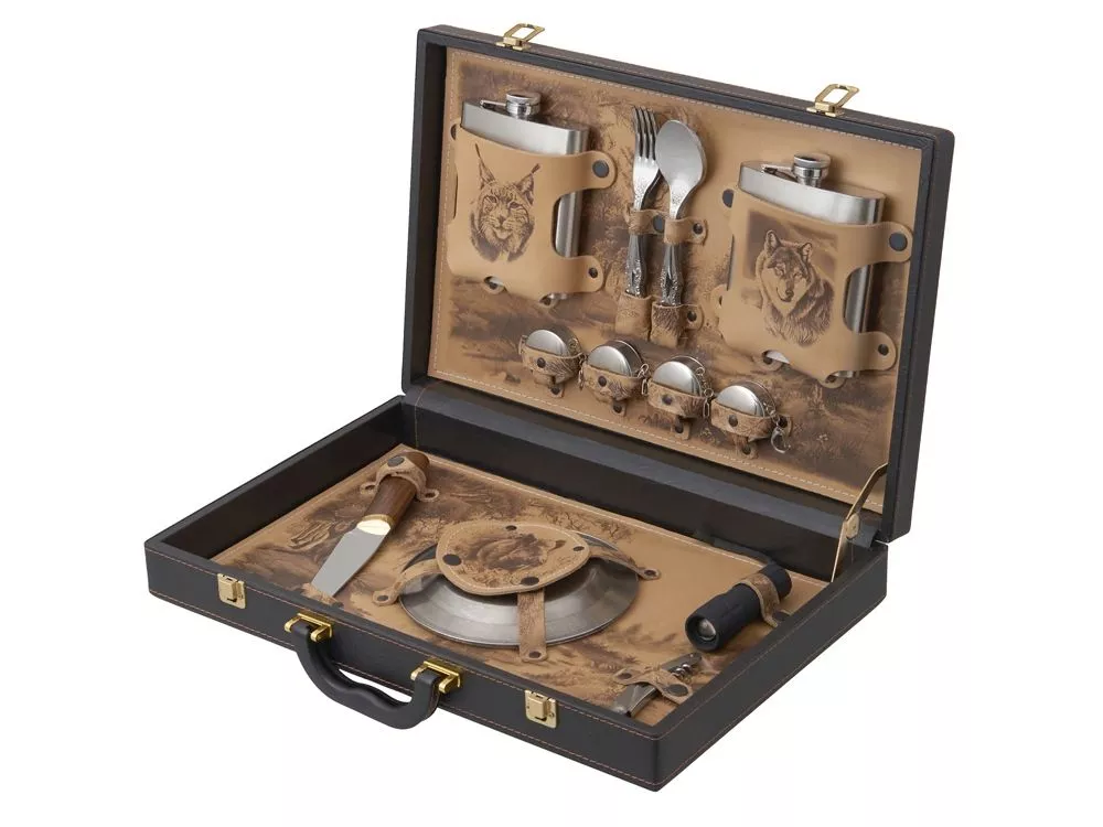Погрузитесь в мир роскоши и комфорта с нашим эксклюзивным подарочным набором. Этот тщательно продуманный комплект идеально подходит для тех, кто ценит стиль и качество в каждом моменте отдыха на природе. Все комплектующие упакованы в кейс из сплит-кожи с внутренней отделкой из натуральной кожи, украшенной художественным выжиганием. Обратите внимание, что художественное выжигание может отличаться от представленного на фото, так как это ручная работа, что делает каждый экземпляр по-настоящему уникальным. В комплекте: - Фляжка 500 мл- 2 шт - Вилки (нерж. сталь)- 4 шт - Ложки (нерж. сталь)- 4 шт - Стопки складные (нерж. сталь)- 4 шт - Тарелки (нерж. сталь)- 4 шт - Штопор- 1 шт - Нож- 1шт - Фонарик- 1шт (батарейки AAA- 3 шт в комплекте)
