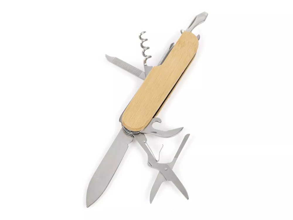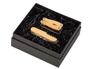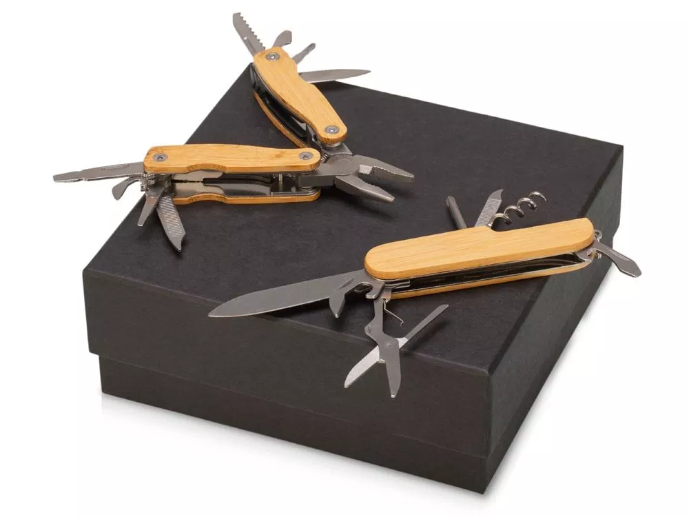Набор состоит из двух предметов: Мультитул-нож для повседневных нужд (состоит из открывалок для банок и бутылок, плоской отвертки, пилки, штопора, ножа и ножниц); Мультитул-плоскогубцы для ремонта (состоит из плоскогубцев, открывалок для бутылок и банок, крестовой и 3-х плоских отверток, ножа, пилы по дереву и напильников по дереву и металлу). Оба мультиинструмента сочетают в себе текстуры металла и теплого натурального бамбука, благодаря чему хорошо ложатся в руку. • легкие и компактные мультитулы на все случаи жизни • мультитул-нож для повседневного ношения, мультитул-плоскогубцы для бытовых дел • качественные и долговечные материалы • подарочная коробка Тиснение (Блинт) на данный товар осуществляется бесплатно. Оплачивается только настройка оборудования в размере 6200 рублей на весь тираж.
