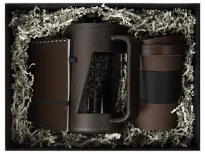 Этот набор не только полностью посвящён кофе, но и сделан из него! Блокнот имеет блок из переработанной бумаги, а в обложку из пластика добавлен кофейный жмых, который придаёт необычную текстуру и делает обложку тактильно приятной. Корпус френч-пресса изготовлен из кофе, древесных волокон и пластика, колба - жаропрочное боросиликатное стекло. Подходит как для кофе, так и для чая. И, конечно, стаканчик для напитков, в составе которого 60% кофейных зёрен! Стаканчик имеет силиконовую манжету, которая не даёт обжечь руки и делает его удобным в использовании. - объём френч-пресса: 600 мл; - объём стаканчика: 470 мл; - ситечко из нержавеющей стали для френч-пресса в комплекте; - подарочная коробка с наполнителем уже включены в набор. Трафаретная печать (1 цвет (цветные изделия)) на данный товар осуществляется бесплатно. Оплачивается только настройка оборудования в размере 10000 рублей на весь тираж.