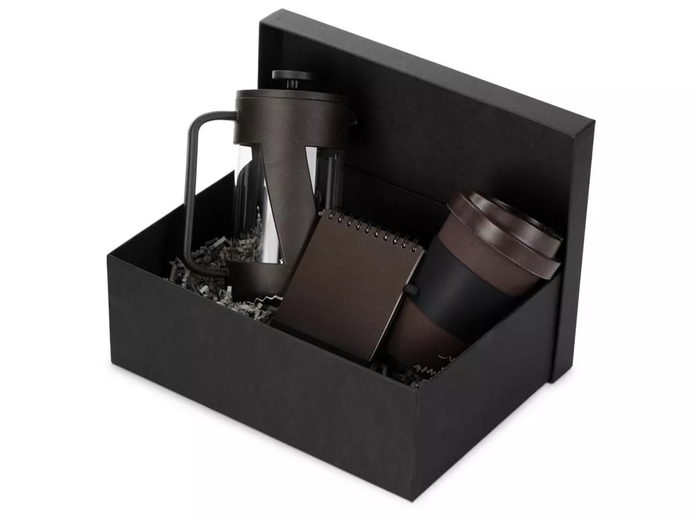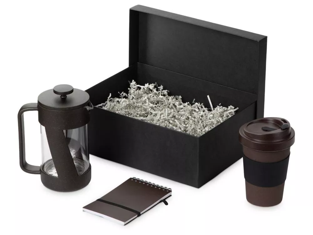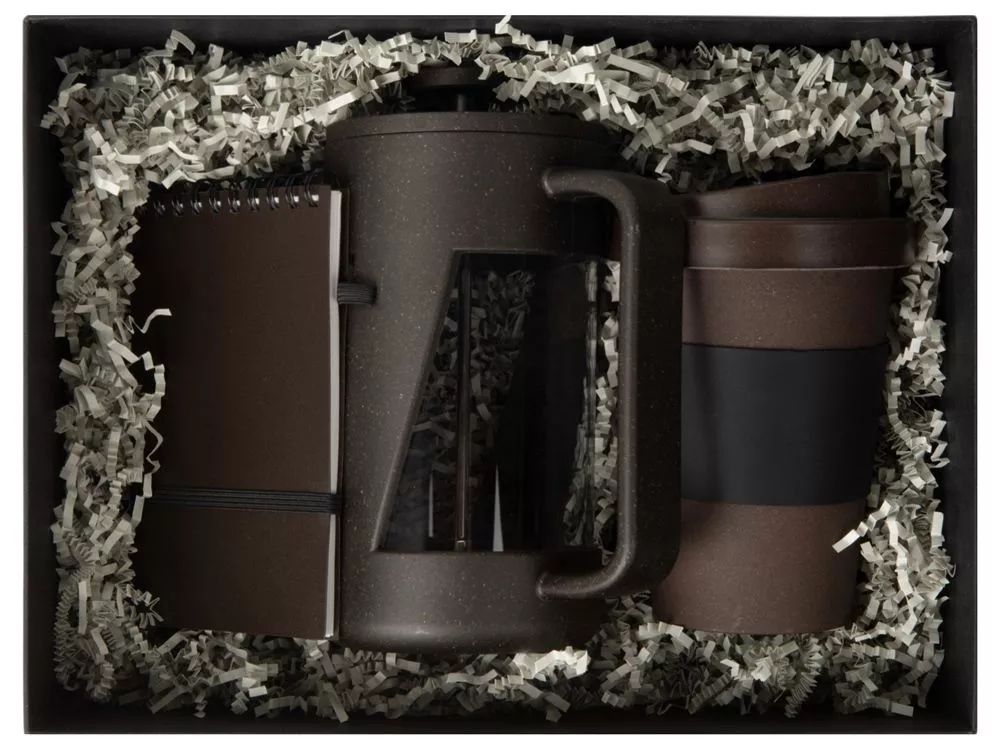 Этот набор не только полностью посвящён кофе, но и сделан из него! Блокнот имеет блок из переработанной бумаги, а в обложку из пластика добавлен кофейный жмых, который придаёт необычную текстуру и делает обложку тактильно приятной. Корпус френч-пресса изготовлен из кофе, древесных волокон и пластика, колба - жаропрочное боросиликатное стекло. Подходит как для кофе, так и для чая. И, конечно, стаканчик для напитков, в составе которого 60% кофейных зёрен! Стаканчик имеет силиконовую манжету, которая не даёт обжечь руки и делает его удобным в использовании. - объём френч-пресса: 600 мл; - объём стаканчика: 470 мл; - ситечко из нержавеющей стали для френч-пресса в комплекте; - подарочная коробка с наполнителем уже включены в набор. Трафаретная печать (1 цвет (цветные изделия)) на данный товар осуществляется бесплатно. Оплачивается только настройка оборудования в размере 10000 рублей на весь тираж.