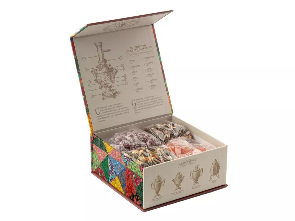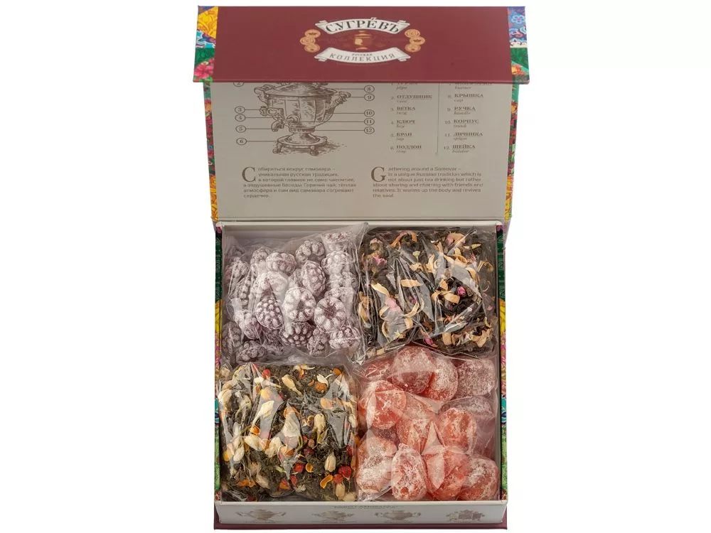 Купажи чая составлены так, чтобы сочетать вкус и аромат отборных сортов китайского и индийского чай с красотой разноцветных лепестков мальвы, лилии, жасмина и акации. В набор также входят монпансье со вкусом чёрной смородины и цукаты из кумквата. Внутри шкатулки находится мини-открытка, которую покупатель может подписать. Состав: Купаж 1: тегуаньинь, цветы акации, цвет жасмина, ароматизатор. Купаж 2: чай чёрный индийский, цветы лиии, мальва, ароматизатор. Кумкват: кумкват, сахар, Е220. Карамель со вкусом Черная смородина : патока, вода, регуляторы кислотности (лимоннаякислота, молочная кислота), ароматизаторы, идентичные натуральным, краситель: кармин, сахар.