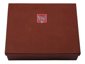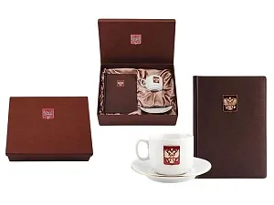 Подарочный набор с ежедневником и чайной парой. Ежедневник формата А5 с декором Герб РФ на щите и фарфоровая чайная пара с золотой отводкой края чашки и блюдца декорированная металлическим барельефом Двуглавый орел. Материал барельефа сплав алюминия с декоративным покрытием под серебро и отделкой эмалью, мартериал ежедневника кожзам. Емкость чашки 220 мл. Ручная работа. Подарочная упаковка. Шильд спектрум (Шильд спектрум) на данный товар осуществляется бесплатно. Оплачивается только настройка оборудования в размере 1100 рублей на весь тираж.