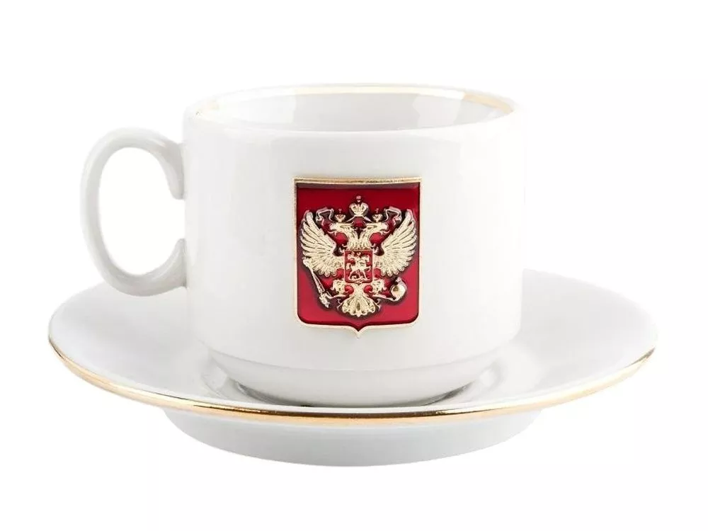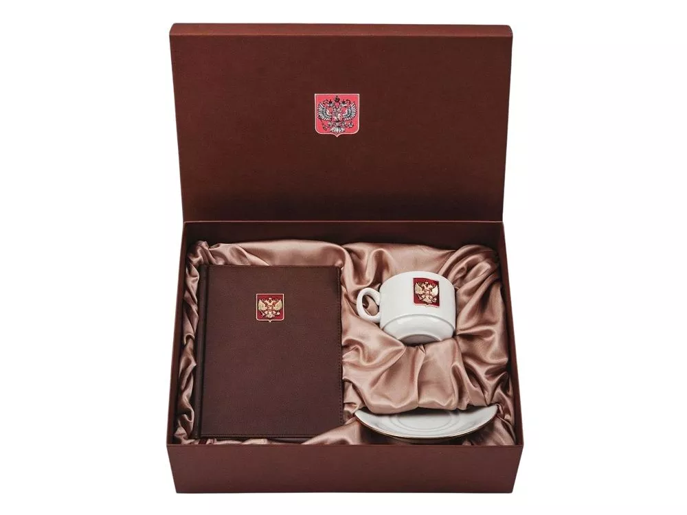 Подарочный набор с ежедневником и чайной парой. Ежедневник формата А5 с декором Герб РФ на щите и фарфоровая чайная пара с золотой отводкой края чашки и блюдца декорированная металлическим барельефом Двуглавый орел. Материал барельефа сплав алюминия с декоративным покрытием под серебро и отделкой эмалью, мартериал ежедневника кожзам. Емкость чашки 220 мл. Ручная работа. Подарочная упаковка. Шильд спектрум (Шильд спектрум) на данный товар осуществляется бесплатно. Оплачивается только настройка оборудования в размере 1100 рублей на весь тираж.