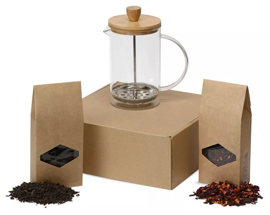 МатериалТовара:Френч-пресс- боросиликатное стекло/нержавеющая сталь/буковое дерево, упаковка чай- картон, наполнитель- бумажная стружка шириной 4 мм