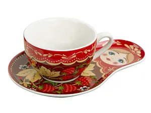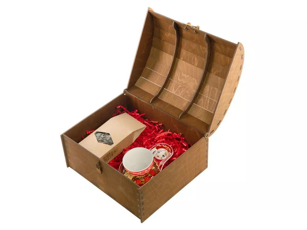 В наборе вы найдете необычную чайно-кофейную пару с подставкой в виде русской Матрешки, которая является одним из главных символов России и чай Глинтвейн фруктовый, 90 г. Набор поставляется в большой деревянной коробке в виде сундука с замочком.
