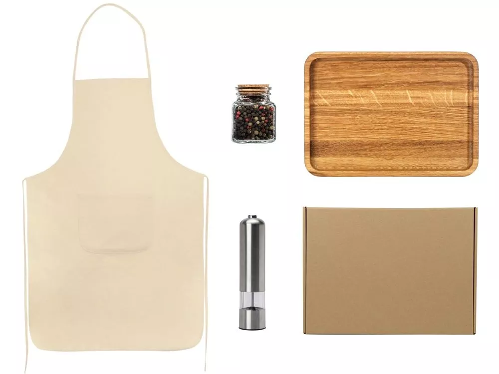 Подарочный набор для кухни с фартуком, подносом, мельницей и специями