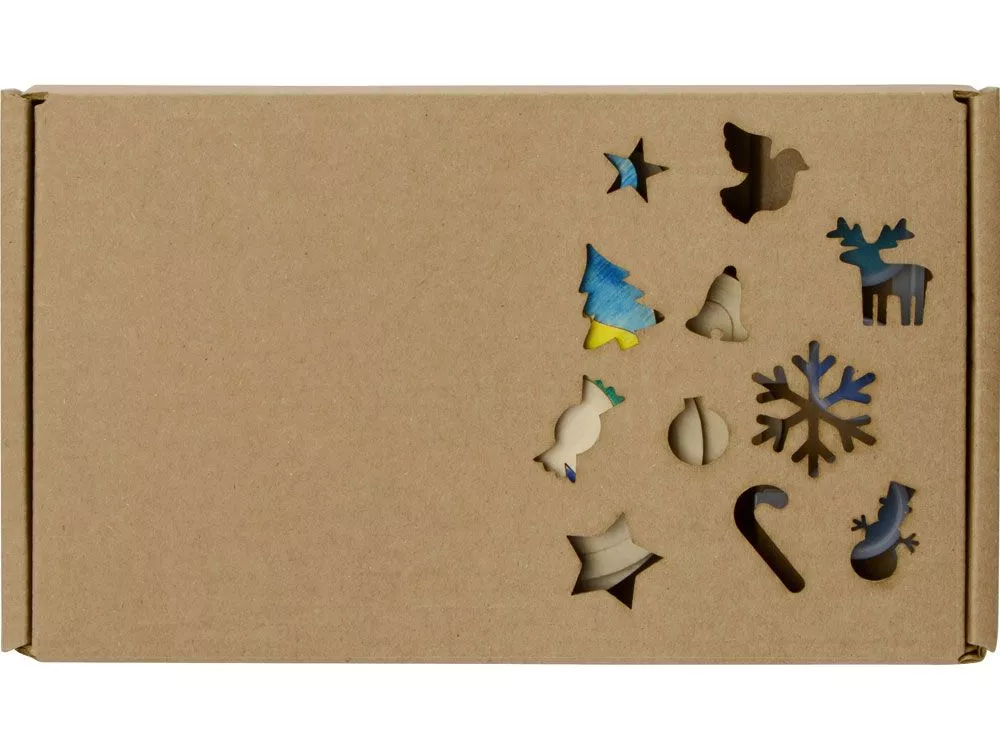 Подарочный новогодний набор для раскрашивания прекрасно подойдет как для детей, так и для взрослых, создаст праздничное настроение для всей семьи не только на вечер, но и на весь период зимних праздников. Фигурки в виде традиционных новогодних атрибутов выполнены из березовой фанеры и хорошо сочетаются с гуашью, которая идет в комплекте. Для раскрашивания приложены краски шести цветов, которые можно смешивать для создания новых оттенков, а также кисточка. Набор упакован в коробку, украшенную вырубкой. Ленты для игрушек в набор не входят. Цифровая печать (наклейка на белой пленке) на данный товар осуществляется бесплатно. Оплачивается только настройка оборудования в размере 900 рублей на весь тираж.