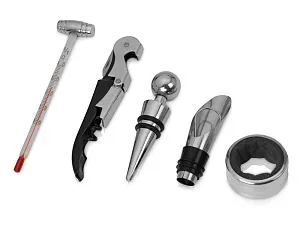 Эксклюзивный набор аксессуаров для вина, будет отличным имиджевым подарком. В комплект входят: штопор-открывалка, воротничок на бутылку, пробка, термометр, воронка-аэратор. Аксессуары упакованы в стильный деревянный сундучок-кейс с деревянной стружкой и отделкой из искусственной кожи для двух бутылок. Роскошный подарок по любому поводу.