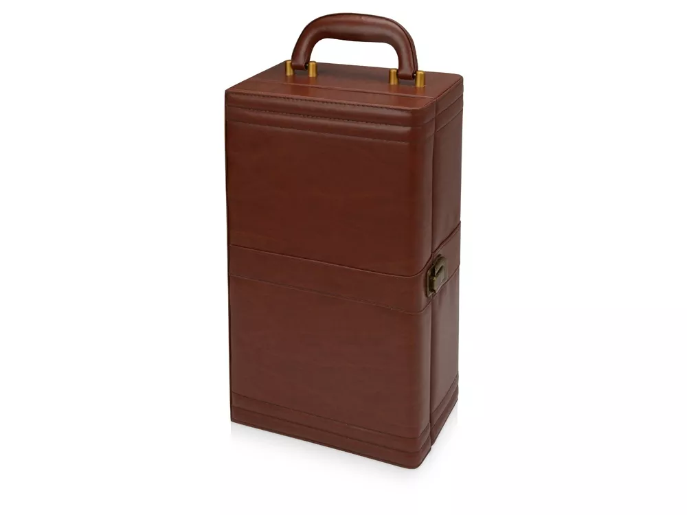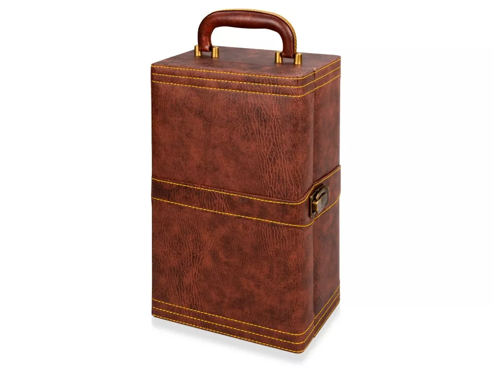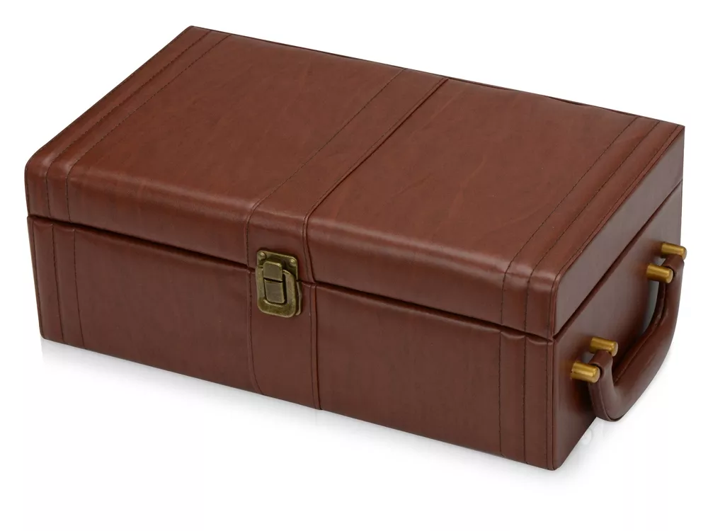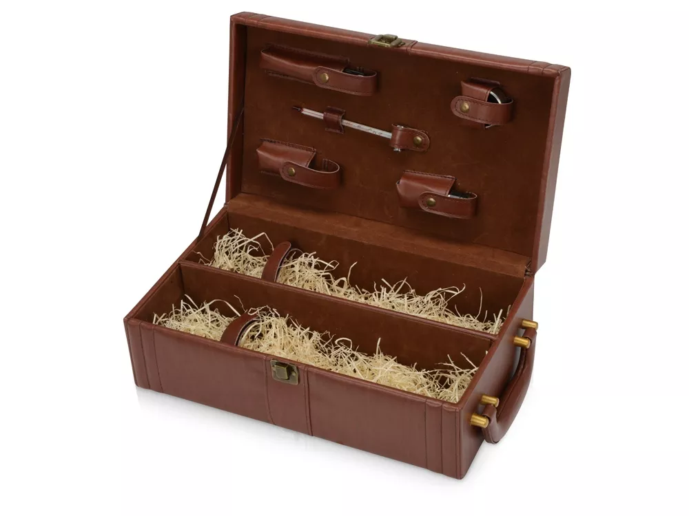 Эксклюзивный набор аксессуаров для вина, будет отличным имиджевым подарком. В комплект входят: штопор-открывалка, воротничок на бутылку, пробка, термометр, воронка-аэратор. Аксессуары упакованы в стильный деревянный сундучок-кейс с деревянной стружкой и отделкой из искусственной кожи для двух бутылок. Роскошный подарок по любому поводу.