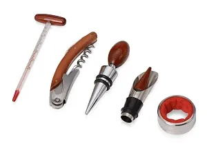 Подарочный набор аксессуаров для вина в эффектной винтажной шкатулке отличной подойдет для людей с тонким вкусом. В набор входят воротничок на бутылку, воронка-аэратор, пробка для бутылки, штопор-открывалка, термометр.