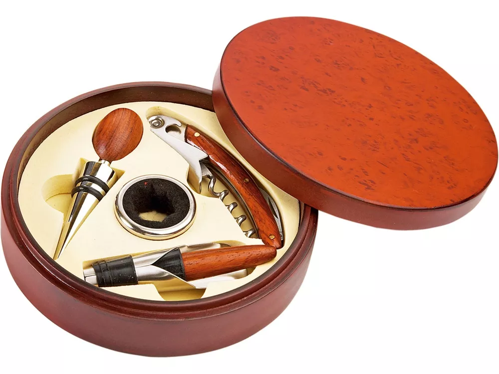 Эффектный набор аксессуаров для вина в круглой подарочной коробке. В набор входят штопор-открывалка - 10,5х2,0х1,0 см; пробка - 10,5х2,0 см; воротничок - 2,0 см х d3,5см; устройство для аккуратного разлива вина с пробкой 9,5х2,0см. Изготовлены из нержавеющей стали.
