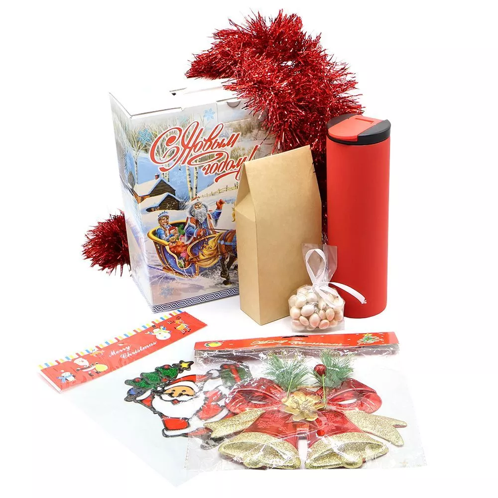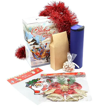 Состав набора: Термокружка с двойной металлической стенкой Rolly, софт-тач, черный– 1 шт.: (Артикул: 5027.02) Подарочная коробка ТРОЙКА ЛОШАДЕЙ – 1 шт. (Артикул: 53004) Новогодняя мишура (микс) – 1 шт. (Артикул: SYMTA-162002) Наклейки на окна (пластиковые) (дед мороз 20*25) – 1шт.: (Артикул: SYBXT-292144) Пластиковое украшение - колокольчики красно-золотистые – 1шт.: (Артикул: SYLD-502095) Драже "Феерия арахис жемчуг" 50г. – 1 шт.: (Артикул: 250 50) Чай черный крупнолистовой в упаковке (Грузия) 70 г. – 1 шт.: (Артикул: 200401)